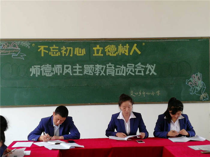 交口中心小学:召开师德师风主题教育活动动员会教育文摘周报三门峡讯(刘宝勤 宋君)为认真贯彻落实区教体局师德师风建设的活动要求,切实转变工作作风,提高教育教学质量,提升教师队伍的整体素质,交口乡中心小学4月20日召开了关于“不忘初心 立德树人”师德师风主题教育活动动员会。