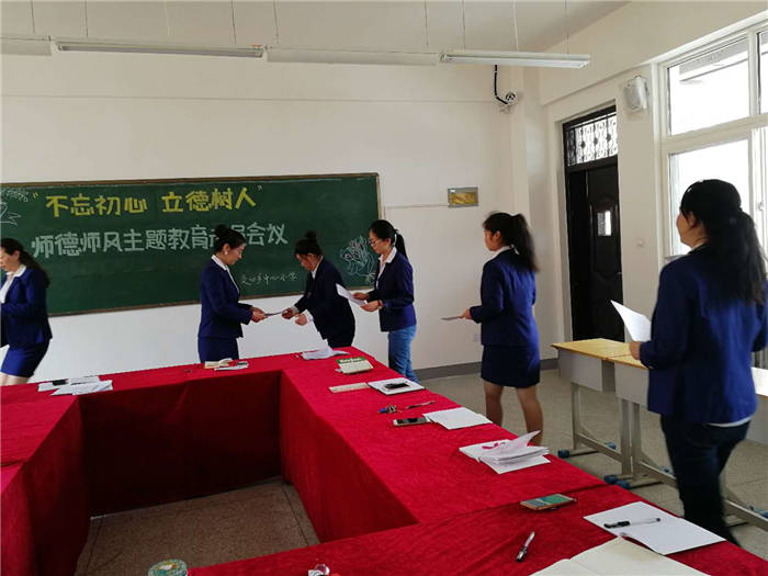 会上,刘宝勤校长做了动员讲话以及宣读了《湖滨区教育系统“不忘初心,立德树人”师德师风主题教育活动实施方案》,李琼副校长宣读了《关于禁止中小学在职教师从事有偿家教的暂行规定》和《湖滨区教师应当做好的78个工作细节(试行)》的通知,教师们递交了师德师风承诺书。