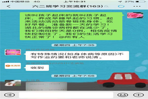 停课不停学 宅家继续教 ——南阳市第三十七小学教师停课不停学一天活动纪实中广视网讯:2020年的疫情定格了冬,阻断了春。全国的中小学全部都延迟开学。学生停课不停学,老师停课不停教,不知不觉,南阳市第37小学的网络教学已持续一周有余,我们在学校指导下一起努力组建基于互联网学习生态的学习共同体,开启了别样的居家在线学习生活之旅。让我们也来回顾一下三十七小老师的一天生活吧! 教师的早课 2020的春日的阳光出来的有点晚,但是三十七的老师已经起床了。起来的第一件事是给全班的学生布置早读任务,经典诵读,背诵古诗,背诵单词…… 然后就是教师自己的任务,查看一天的教学任务安排是否遗漏,然后抓紧时间开始运动,开始侍弄花草,做饭,吃早餐……