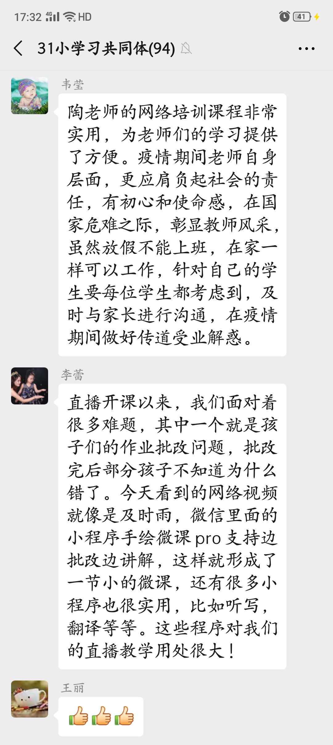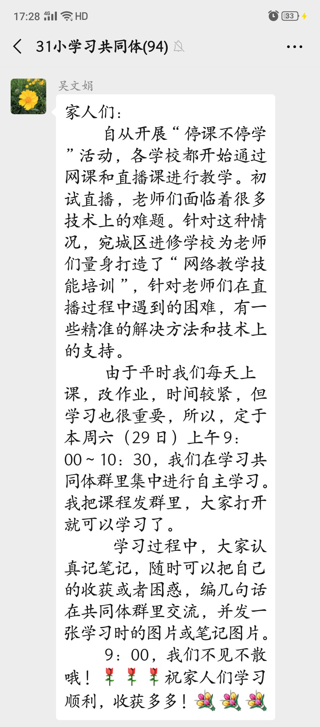 2月29日上午,在教导处文娟主任的组织下,全体教师共同在线学习了宛城区进修学校为老师们量身打造的“网络教学技能培训”。这次学习就像是一场及时雨,为老师们在直播过程中遇到的困难,找到了精准的解决方法和技术上的支持。老师们在学习共同体中纷纷发表自己的学习心得与收获。