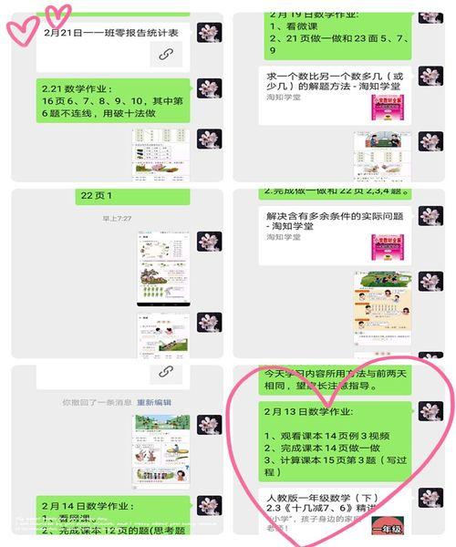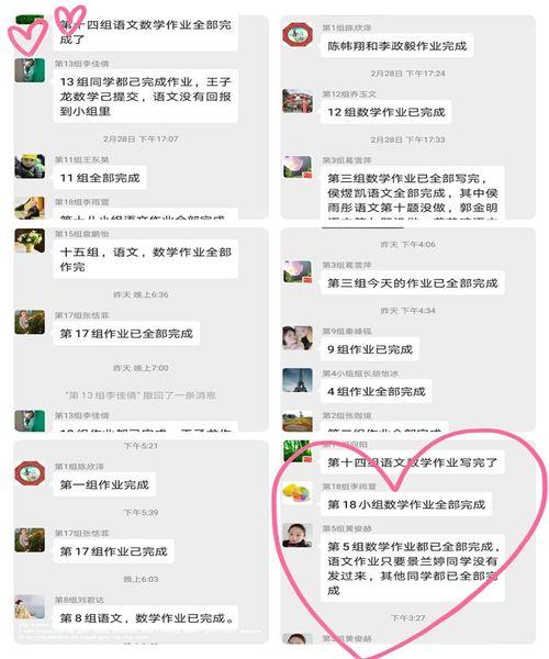 雷教师每天按时发送学习内容及要求,及时点评学生作业,为学生解惑,总结当天作业完成情况,鼓励学生在家做好学习。 小组管理,家校共育,成长不止步 小学生年龄小,自律性差,雷老师就以每5人一小组,把班级分为若干小组,建立小组管理机制。在家长的帮助下,每天组员作业发小组群,组长作业发组长群,教师批改组长作业,组长再批改组员作业,并按时汇报组员作业完成情况。家校携手,共同促进学生成长。 在老师和家长的共同努力下,一一班学生收获多多! 孩子们每天按时网上学习,认真写作业。