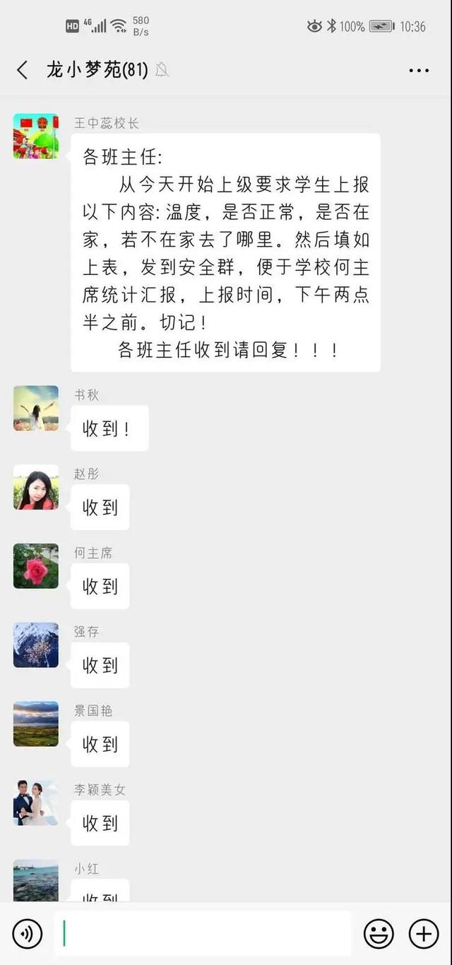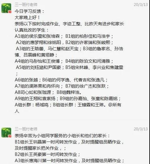 疫情就是命令,防控就是责任。1月30日,当接到学校部署第一项任务统计人员,排查每个学生外出情况。付老师积极响应,迅速行动,马上在微信群发布信息,做好汇总,不到两个小时,全班学生一个不漏的统计上报,打赢班级疫情防控第一战。 付老师利用班级的微信群、校信通、短信等渠道及时发布有关防控要求和信息,对学生及家人进行体温和健康状况排查并做好记录,坚持做好“日报告”、“零报告”工作,确保疫情防控措施不折不扣地落实到位。 2月10日,“停课不停学”宅家学习开始,付老师更忙了,因数学老师产假,她给学生发布河南省教育厅名校《同步课堂》课程表,指导学生按时收看的同时,还要对语文、数学两个学科进行辅导,指导学生分组、批改学生作业、解答学生疑问、完成作业统计等等,有时忙的饭都不能按时吃,家人饭热了一遍又一遍,但她从不抱怨,说谁让我选择做老师,更何况现在是非常时期。除此之外,她每天要上传学生上网课图片、亲子阅读图片、才艺展示图片、运动或活动的图片,还要完成学校安排的临时性工作。