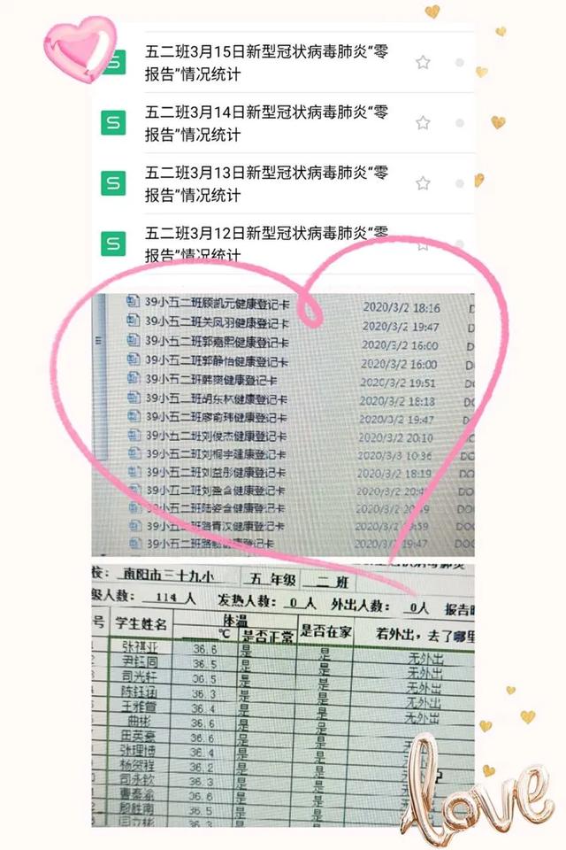 默默坚守 阻击疫情 护航育人—南阳市第三十九小学刘娟萍老师疫情防控期间工作纪实—南阳市第三十九小学刘娟萍老师疫情防控期间工作纪实中广视网讯:一场突如其来的疫情席卷全国,我们的生活被按下了暂停键,目前,新冠状肺炎疫情防控工作仍处于关键期。南阳市第三十九小学全体教师在以王中蕊校长为首的领导班子的带领下,认真落实市、区教育局相关工作部署,全校上下一心,积极开展疫情防控,“停课不停学”,护航育人,决胜这场没有硝烟的战"疫″。 刘娟平,南阳市第三十九小学五二班的班主任、数学教师,示范区优秀教师。疫情到来之际,她虽不能像白衣天使一样抗战在抗疫一线,但仍积极响应国家号召,努力做好疫情防控工作,默默坚守在教育一线,培育祖国的花朵健康成长。 一、做护花使者防控疫情 每天早上从在班级群提醒学生及家长测量体温开始,刘老师指导学生汇报基本情况:有没有在家做好自我隔离,家人有没有从外地回来,现居住何处。了解学生及家长的活动轨迹,全面排查信息并做好详细记录。同时给学生普及防疫知识,消除学生恐惧心理的同时,引导学生做好自我防护,不信谣,不传谣,科学防控。精心制作表格,提醒家长及学生,认真及时填写“每日健康卡”和“每日新型肺炎零报表”。然后再仔细整理数据了解情况,时常还要打电话询问学生情况,确保每位学生都安全。 疫情防控同时,她组织学生开展《齐心协力,战胜疫情》主题活动,同学们制作了手抄报,为武汉加油,为祖国加油,也表达了同学们的爱国情怀。 组织学生观看《疫情中的法与我们》法治教育专题片,通过观看,让孩子们知法、懂法、守法,做到从我做起,保证不在疫情面前给国家添乱,做一个真正知法、懂法、守法的好公民,同学们都写下了自己的感悟。 二、防疫学习两不误,报效祖国我义务。 在保证学生身体、心理健康的同时,2月10日网上教学正式开启。刘老师采用直播课堂学习、观看微课补充、精选习题巩固的方式。同时积极推行生本课堂管理方式:班级分为六人一小组,引导学生小组内通过信息或语音群聊讨论问题,班级群质疑。她在小组内指导,通过批改作业查找问题,然后在线互动,集体解疑和个人解惑相结合。并且请求家长的协助,促使学生真正获取知识,不断提升自身能力,为做好社会主义接班人奠定基础。 坚持日反馈,周反馈