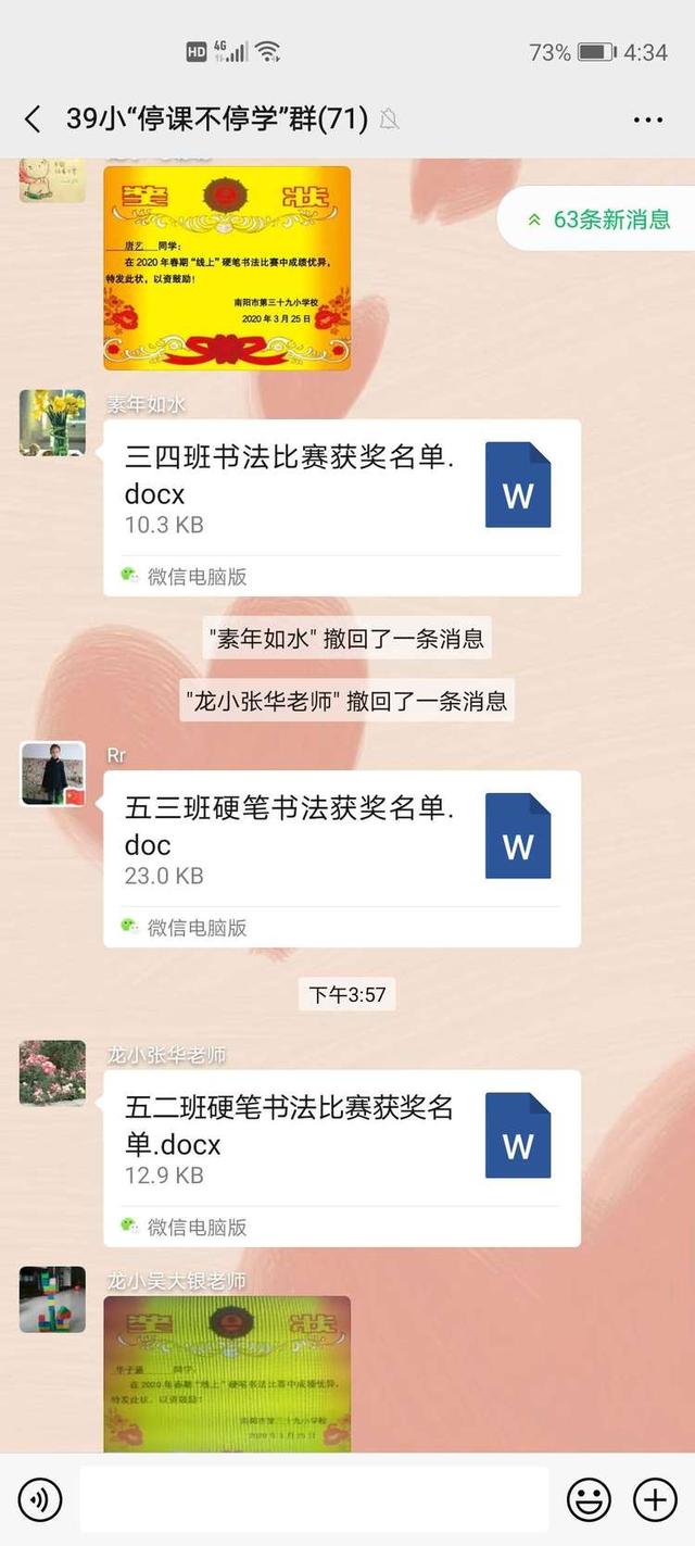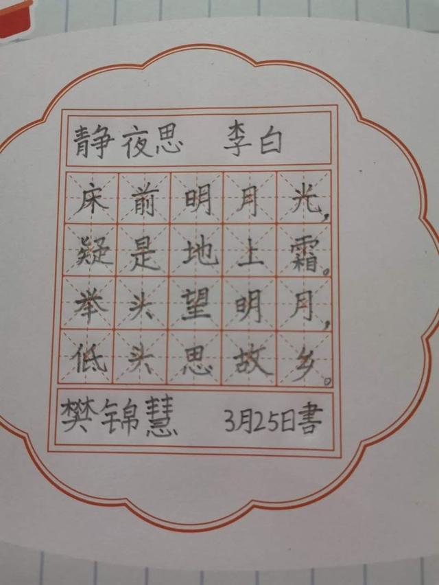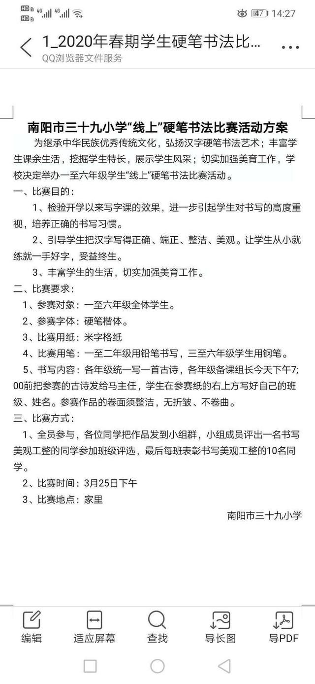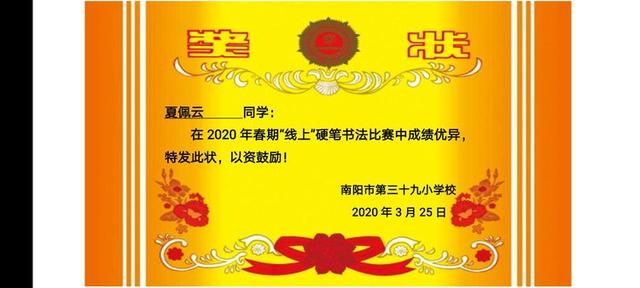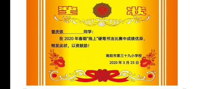 传承中华文化 书写精彩人生——南阳市第三十九小学举行“线上”硬笔书法比赛活动中广视网讯:书法是中华传统文化的根儿,什么时候也不能丢弃。为传承中华书法文化,提高学生汉字书写的规范意识和审美品位,引导学生把汉字写正确、整洁、美观,促进学生全面发展,3月25日下午,南阳市第三十九小学举行了“线上“硬笔书法比赛。 比赛按学段要求用铅笔或钢笔书写,书写内容、纸张统一要求,书写规范,字迹工整,并提醒同学们写字姿势要正确,要有一定的书写速度! 一张张纸上呈现出一个个字迹工整,优美流畅的字迹,充分展示了同学们良好的素质和语文素养。 一个个规范的笔画,一个个美观的汉字,从学生的笔尖流淌出来,犹如串串美妙的音符,谱成了汉字书写的美妙乐曲! 或遒劲有力,或隽永俊秀,或细腻丰富,或清新率真,孩子们用自己的个性和才华书写着古老而又富有朝气的中国汉字! 一张张让人赏心悦目的书写,是常年累月练习的结果; 一笔笔铿锵有力的运笔是一次次精益求精的追求!
