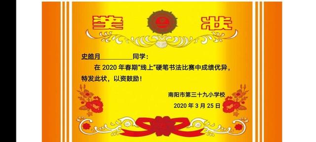 中国有句古话"人能写字,字能写人",写字教学具有强大的潜在育人功能。将汉字的一撇一捺在孩子们的心中描绘出别样的色彩,将汉字的意蕴悠长刻进孩子们幼小的心田。 书写结束后,家长帮助孩子们将书写作品上传到小组群里老师和家长评选出优秀作品,并颁发奖状。 赛后,评委老师从写字姿势和卷面等方面情况综合评估学生的写字水平,并挑选出优秀作品进行表彰。 本次硬笔书法比赛,展示了学生的书法风采,培养了学生的书法兴趣和爱好,丰富了学生学习生活,南阳市第三十九小学将以此次书法比赛为契机,进一步营造良好的书写氛围,弘扬中华书法文化,提升学生综合素养!(邢有军 周珂 申红艳) |