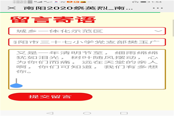 南阳市第三十七小学党支部举行网上祭英烈活动中广视网讯:为积极响应南阳市委、市文明委、示范区教育中心党委和白河教育总支号召,南阳市第三十七小学党支部书记任成安同志号召全体党员及教师清明节期间开展网络文明祭扫英烈活动。