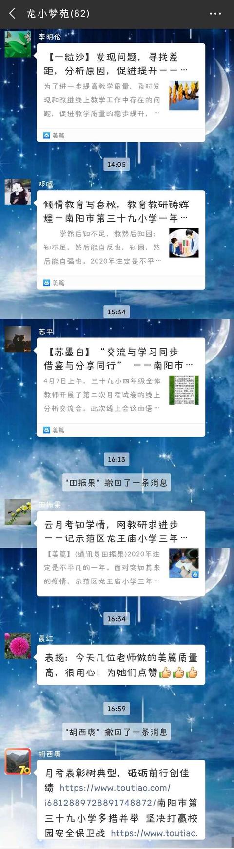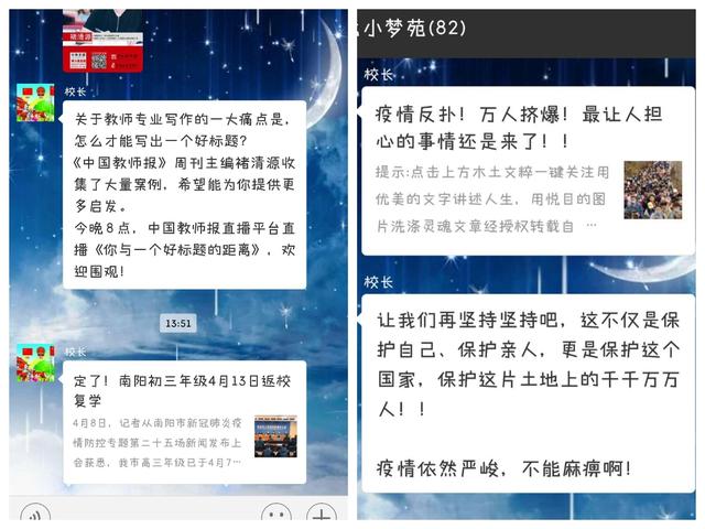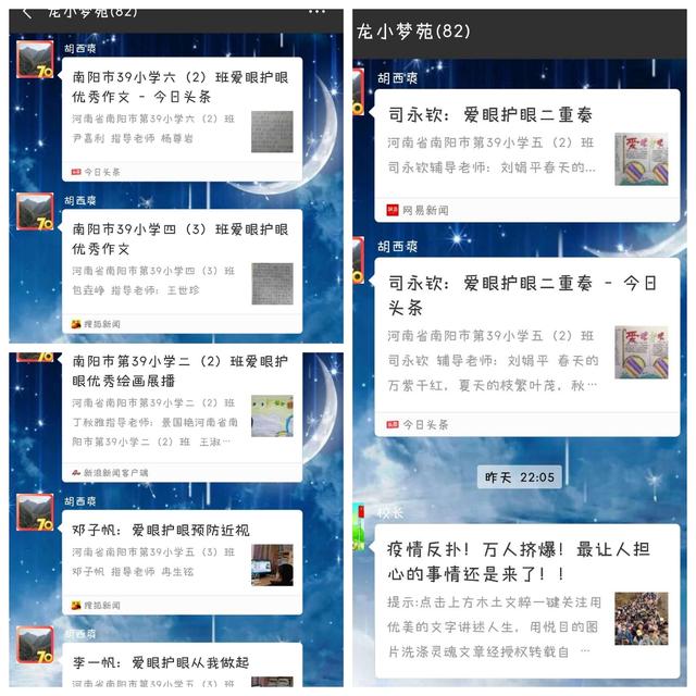 砥砺奋进 只争朝夕——南阳市三十九小学师生“停课不停学”我们一直在中广视网讯:吕尽律回,百草回芽。对于14亿华夏儿女而言,这是一个不一样的“悠长假期”。一场突如其来的新冠肺炎疫情打破了庚子年春节的祥和,不仅医疗系统奋战在第一线,南阳市三十九小学的教师团队也严阵以待。风声雨声读书声,家事国事天下事,必须入耳入心,时代宏大,没有人能置身事外!疫情打乱了我们的学习和生活节奏,但是,生活即教育,要读好这本“无字之书”,这是我们共同成长的课堂。 每天的疫情防控零报告成了每位师生的“必备早餐”。积极认真的填写报告单,确保每位师生的健康。 王校长每天向大家推送有关疫情和复工复学消息,让家人们第一时间获得最新消息。 面对这场新冠肺炎疫情防控战,我们毫不松懈!为积极响应教育部关于“停课不停学”的部署,全体龙小人在行动!全体任课教师在校领导的指挥下全力保障“停课不停学”的顺利落地。这是我们共同的课堂,也是我们共同的战“疫”!我们准备好了,全体同学已经“云端”开学,顺利启动了不一样的开学季;全体老师早已在岗在位,一批批教师更是创新教学方式,秒变专业主播;怀揣着从教的真心、仁心、慧心为同学们保驾护航,“做黎明破晓前的启明星、做孩子温暖的守护神、做快速变化中的行动派、做社会教育的传道者、做一名坚定的‘长期主义者’”,积极营建战“疫”中平和安宁的知识殿堂和心灵港湾。 “放下手机,让我们的眼睛放会儿假”,孩子们通过绘画和习作的形式展示学校“空中爱眼课堂”活动成果。 每一个假期都是充电的最佳时机,每天学习一点点,进步一大步。生本学习心得、读书心得……分享自己的收获,在交流中共进步。“字”是教师必须掌握的第二项技能,每天坚持练一页字,提升自己的书写技能。 体育老师每天精选适合室内做的各种活动,分享给师生,开启室内强身锻体之路。学习之余来一段室内运动劳逸结合,别有一番滋味。 凡是过往,皆为序章,道阻且长,行则将至。今日我们换一种方式,换一个阵地,云端学习,砥砺奋进,脚步坚定,只争朝夕。每一粒熬过冬天的种子,都有一个关于春天的梦想。此刻,冬将尽,春可期,让我们共盼山河无恙。(邢有军 姬玉珠) |