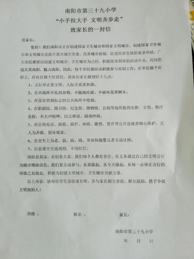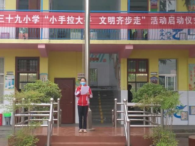 争做合格公民,争创文明城市——南阳市第三十九小学举行“小手拉大手,文明齐步走”活动启动仪式中广视网讯:近日,南阳市“小手拉大手,文明齐步走”主题实践活动启动仪式在南阳市第十五小学校孔明路校区举行。创文明城市,建幸福家园,是每个南阳市民的共同心愿。南阳市第三十九小学积极响应市政府号召,于6月8日上午举行“小手拉大手,文明齐步走”活动的启动仪式。学校以活动启动仪式为新的教育契机,引领学生及家长从一言一行做起,从身边小事情做起,告别陈规陋习,养成文明习惯,带动家庭,影响社会,共建我们美丽的南阳家园。 第一项:政教副校长杜校长宣布启动仪式开始。 第二项,王中蕊校长作动员讲话。王校长向同学们讲述中华文明礼仪之邦的传统美德、南阳市创建文明城市的重要意义,并对同学们在文明校园创建中如何做,提出具体要求.她向同学们发出倡议:不仅自己讲文明礼仪,遵守社会公德,还要带动家长一起行动,小手拉大手,文明齐步走。 王校长的倡议: 1、从我做起,争当知礼向善的好公民,塑造文明市民形象,学习文明礼仪,践行文明规范,塑造一流市民素质。 2、从我做起,人人维护公共秩序,处处遵守社会公德,自觉遵守交通规则,摒弃公共场所的不文明陋习,形成一流的公共秩序。 3、希望每一位师生都能够遵守《南阳文明市民公约》,在校做个好老师、好学生,在社会做个好公民。 4、希望我们每一位小学生用我们的小手拉起所有家长的大手,共同托起我们 第三项,许娜老师做国旗下讲话。许老师列举出一些不讲文明的现象,引起同学们的反思,号召大家唾弃陋习,拒绝陋习,文明自己的行为,做新时代的文明小公民。 第四项,学生代表马婧彬发言。她再次向同学们发出号召,并带领全体同学宣誓:决心做文明学生、文明公民,今天大家立下铿锵誓言,明天会用行动去落实。 升旗仪式结束后,各班在教室进行了“小手拉大手,文明齐步走”主题班会,在老师的指导下,同学们谈理解、谈决心、谈计划、谈行动,让学习文明礼仪、遵守社会公德的意识扎根于每个同学的心中。 第二节大课间,学校领导带领全体师生进行“小手拉大手,文明齐步走”签名仪式,我们写下浓墨重彩的一笔,定会让自己的行动出彩! 为了使本次活动扎实深入开展,入耳、入脑、入心、入行,我们还进行了“小手拉大手,文明齐步走”手抄报比赛和征文比赛。孩子们用稚嫩的笔写下文明社会的理想,描摹文明社会的美好蓝图。 创建文明城市是每个公民的社会责任,孩子们在积极行动,大人们怎能甘心落后呢?我们通过学生传递给家长一封信,一个孩子带动一个家庭,大家一起为建设文明社会贡献力量。南阳市第三十九小学通过丰富多彩的活动对孩子进行文明礼仪教育,就是要让这种美德占据孩子的心灵,成为合格的现代化公民。同时也希望通过孩子引起家长重视,激发大家热爱家乡创建文明城市的热情,形成讲文明守礼仪的良好社会风尚,让文明之花开遍南阳大地!(邢有军 段一平 杜书芳) |