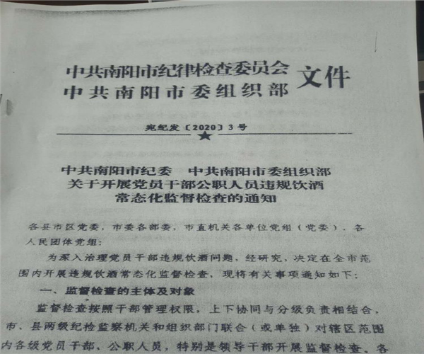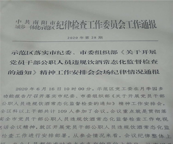 杨长奇副校长首先宣读了《中共南阳市纪委、市委组织部关于开展党员干部公职人员违规饮酒常态化监督检查的通知》以及中共南阳市城乡一体化示范区纪律检查工作委员会2020年第28、29期工作通报。