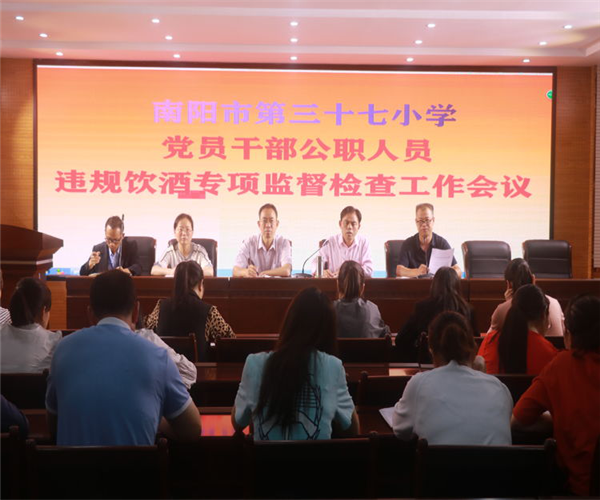 南阳市第三十七小学召开党员干部公职人员违规饮酒专项监督检查工作会议中广视网讯:为贯彻落实《中共南阳市纪委、中共南阳市委组织部关于开展党员干部公职人员违规饮酒常态化监督检查的通知》的工作要求,抵制享乐主义和奢靡之风 ,管住“舌尖上的腐败”,廉洁从教,按照示范区教育中心和白河中心校工作安排,6月17日下午,南阳市第三十七小学召开党员干部公职人员违规饮酒专项监督检查工作会议。