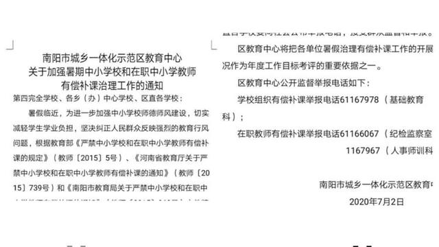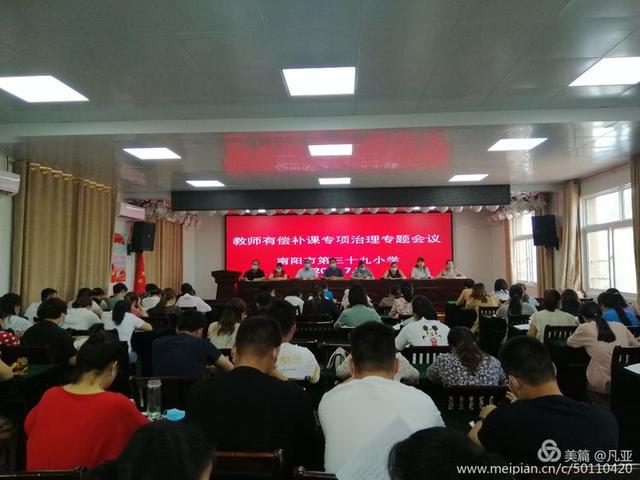 弘扬高尚师德 潜心立德树人——南阳市第三十九小学召开教师有偿补课专项治理专题会议中广视网讯:为了贯彻落实示范区教育中心“三个三、六个做到”工作精神,规范教师从教行为,加强教师的师德师风建设,有效治理有偿补课不良风气,维护健康优良的教育风气,2020年7月5日,南阳市第三十九小学集中召开了教师“有偿补课专项治理”专题会议。 首先,黄校长传达了示范区教育中心关于治理教师有偿补课专题会议精神,黄校长要求:第一,全校教师要从立德树人的根本任务和师德师风建设的高度认识治理教师有偿补课专项行动的重要性和严肃性,提高认识,转变观念,自觉提升师德素养,强化敬业奉献意识,努力做让人民群众满意的“四有”好教师。第二,每一位教师都要守住职业道德底线,守住师德底线,守住自己的课堂,要珍惜个人荣誉,维护学校形象,做一名清白的老师。第三,学校成立以王校长为组长、领导班子成员、教师代表为成员的治理有偿补课专项工作小组,全体教师将向家长和社会做出公开承诺,接受家长和社会的监督。 大家认真学习《南阳市城乡一体化示范区教育中心关于加强暑期中小学校和在职中小学教师有偿补课治理工作的通知》以及南阳市教育局、城乡一体化示范区加强暑期有偿补课治理工作的文件要求。