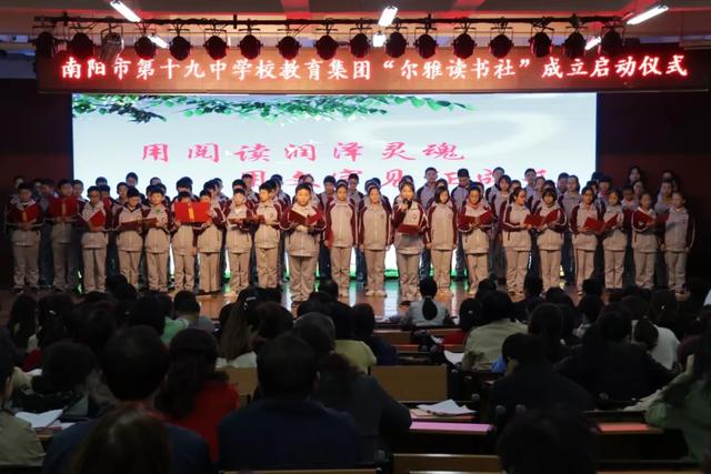 2019年9月12日下午,南阳市第十九中学中秋诗会暨全民悦读南阳阅读会十九中学悦读基地成立仪式,在十九中学报告厅举行。 南阳市语言文字办公室主任雷华敏;全民悦读南阳阅读会名誉主席、著名文化学者、南阳市书法家协会副主席张兼维;宛城区委宣传部外宣办主任袁永强;宛城区教育体育局副局长武向东;仲景街道办事处副主任袁延举;宛城区教研室主任段天才;宛城区教育体育局人事股负责人邢友春,应邀参加诗会。 河南省优秀教师,历任“夏青杯”南阳赛区评委,“河南省教育厅经典照亮人生”朗诵大赛一等奖获得者,信阳师院教授李宛平;南阳博物馆社教部主任李虹;全民悦读南阳阅读会秘书长王颖;全民悦读南阳阅读会副秘书长、央视综艺主持人、中国第七届主持人大赛河南区金奖获得者吕东豪;著名摄影师、全民悦读南阳阅读会会员雨林;全民悦读南阳阅读会副秘书长韩雨果;南阳市教研室语文教研员张广林;宛城区教研室语文教研员张延杰,特邀参加诗会。 全民悦读南阳阅读会名誉主席、著名文化学者、南阳市书法家协会副主席张兼维老师,首先向第十九中学阅读基地的成立表示祝贺,他表示,这是“书香进校园”工程的一个美好开端,相信在以后的日子中,第十九中学一定会利用好这个平台,双方共同努力,打造更多有意义的活动,让阅读快乐起来,为中华文明发声,让每一个人都能“悦听、悦读、悦生活”,为中华文化的伟大复兴而努力。 张兼维老师向第十九中学教育集团授予来自北京总部的阅读基地牌。 二、“尔雅读书社”成立 2019年10月28日下午,南阳市第十九中学校教育集团“尔雅读书社”成立启动仪式在十九中本部五楼报告厅举行。