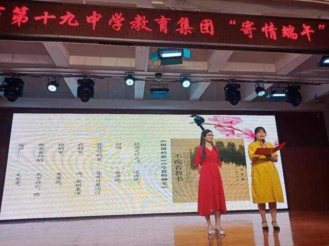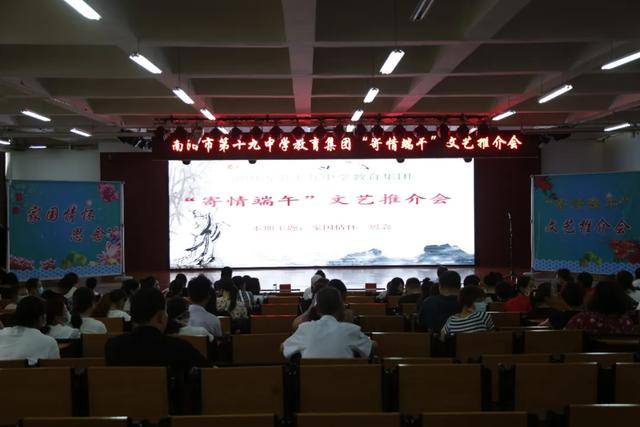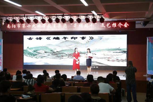 十二、“寄情端午”——文艺推介会 2020年6月24日下午,南阳市第十九中学教育集团举办“寄情端午”——文艺推介会,本期推介会主题词:家国情怀、思念。来自教育集团的共13名教师作为嘉宾,进行书籍、影视作品、歌曲、舞蹈等不同类型的文艺作品推介。 南阳市宛城区教育体育局副局长薄秀林特邀出席活动,教育集团校长刘俊峰及全体集团领导班子成员、教师代表、部分家长代表观看演出。