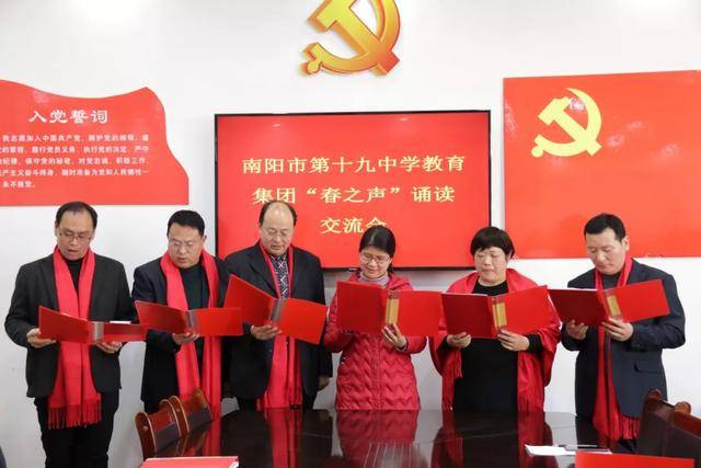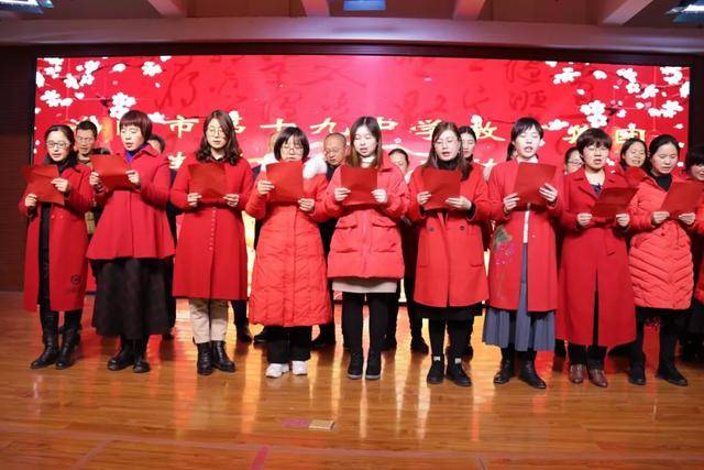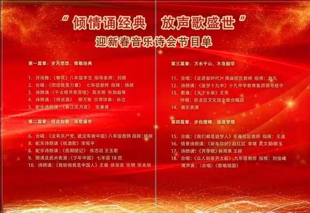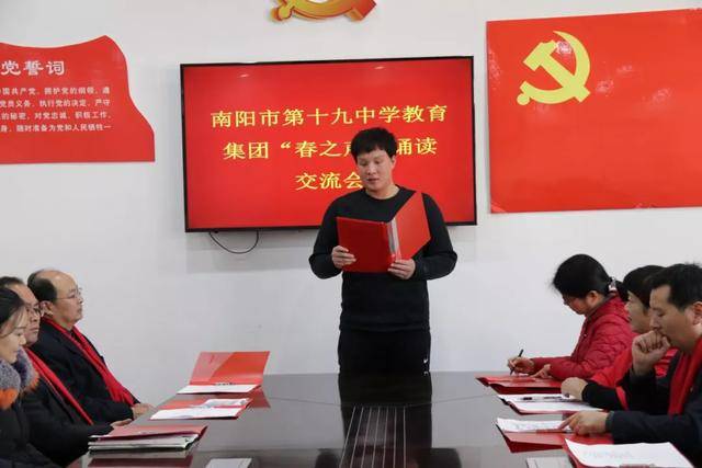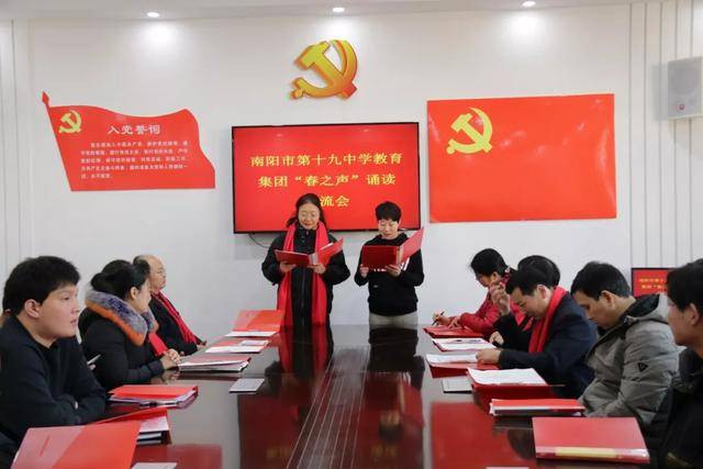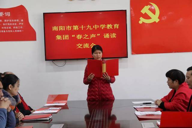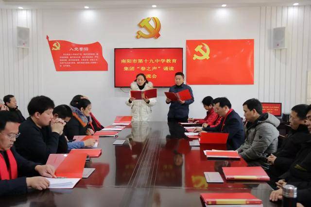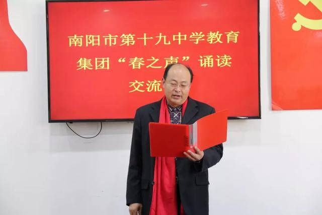 读书节活动已经落下帷幕,但十九中师生的阅读之路不会停滞。我们期望看到,学校的每一位同学都能藉此捧起一套经典,与大师为友,静心阅读,来充实自己的心灵;我们期望看到,学校里每一位同学的家庭都能坐拥一壁藏书,上至天文地理,下至草木虫鱼,大至立身处事,小至人情物理;我们期望看到,每一个班级都利用好读书节活动,形成良好的阅读氛围!最终,让我们因阅读而有力、而丰盈、而幸福! 五、“倾情诵经典,放声歌盛世”迎新春音乐诗会 2020年1月14日下午,“倾情诵经典,放声歌盛世”迎新春音乐诗会在第十九中学报告厅举行。本次音乐诗会由南阳市妇联、宛城区妇联、宛城区文联主办,由南阳市第十九中学教育集团承办。全民悦读南阳阅读会、南阳市播音朗诵协会协办。 到会的嘉宾有南阳市妇联副主席庄旭阳,南阳市新能源经区管委会副主任、中国楹联学会成员、宛城区民间文艺家协会顾问姚河予,南阳市书法协会副主席、著名文化学者张兼维,南阳市语言文字工作委员会主任雷华敏,大河报主任记者、南阳市政协委员、宛城区政协常委郭启朝,南阳市博物馆副馆长、全民悦读南阳阅读会副主席王玉君,宛城区妇联主席宋玉翠,宛城区文联主席周仁明,宛城区宣传部外宣办主任袁永强,南阳师范学院语言学教授李宛平,南阳晚报、南都晨报、大河报、南阳网等相关媒体,宛城区教体局党组成员、副局长武向东、宛城区教研室副主任齐延华、宛城区教研室工会主席张延杰、十九中学教育集团等相关领导出席了活动。