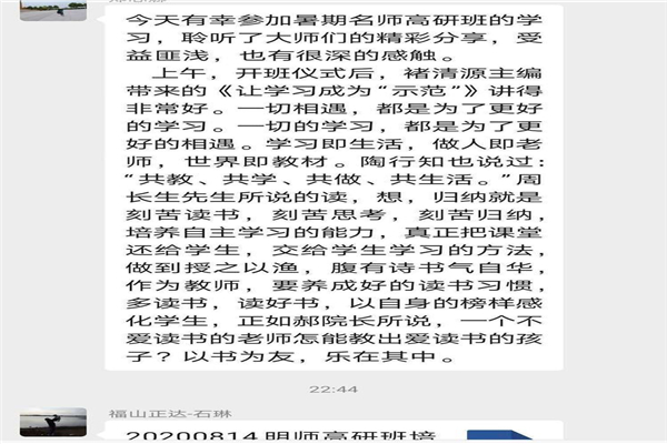 陶行知也说过:“共教、共学、共做、共生活。”周长生先生所说的读,想,归纳就是刻苦读书,刻苦思考,刻苦归纳,培养自主学习的能力,真正把课堂还给学生,交给学生学习的方法,做到授之以渔,腹有诗书气自华,作为教师,要养成好的读书习惯,多读书,读好书,以自身的榜样感化学生,正如郝院长所说,一个不爱读书的老师怎能教出爱读书的孩子?以书为友,乐在其中。告诫老师们要不断学习,敢于挑战自己,并坚持做下去,最终让自己活成一束光。引导我们以儿童为师,以同伴为师,以自己为师,扩大自己的阅读面,坚持记录自己的所思所想,让自己的人生具有作品感,也用自己学到的知识一点一点来改进自己的课堂,提高自己的教学能力。