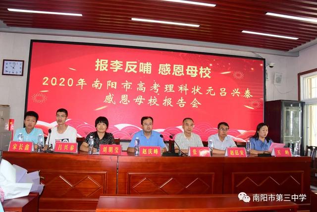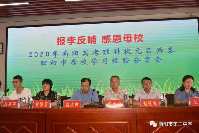 南阳市三中举行2020年市高考理科状元吕兴泰感恩母校报告会报李反哺 感恩母校 会议现场 中广视网:我校2017届毕业生吕兴泰以优异的成绩升入南阳市一中,在今年高考中又以总分722分成为南阳市理科状元,并被清华大学电子信息系录取。 2020年8月17日上午,吕兴泰同学回到母校,学校举行了“报李反哺 感恩母校”吕兴泰感恩母校报告会,以表达他对三中母校的感激之情。学校部分领导和师生参加。 主持人 参会学生 01 三中教育集团校长赵庆峰为状元颁奖 颁奖 讲话 赵庆峰校长发表了热情洋溢的讲话。他用了三个 “感谢”来抒发内心的感慨。一、感谢吕兴泰同学选择了和谐奋进的三中,让我们每个人深深地感受到他的自信努力,感谢自强不息的他为三中争光!二、感谢辛勤工作的老师,是你们的无私奉献,成就了辛勤努力的孩子们。你们是阶梯,是无私的臂膀,是三中挺起的脊梁,是全体三中人为之心悦诚服的骄傲!三、感谢社会各界、感谢各位家长对三中不离不弃的支持与信任!让朝气蓬勃的三中,在致力于每个学生发展的道路上,与社会各界、各位家长并肩奋斗、勇往直前! 赵校长强调,要铭记“志当存高远 敢为天下先”的校训,以河南省文科状元勾艺霖、市理科状元吕兴泰同学为榜样,践行“拼搏三年,幸福一生”的誓言! 02 吕兴泰同学分享学习经验 感恩 分享 在吕兴泰心目中,三中就是一个温暖的大家庭,班主任刘明莹老师要求学生自信当家、重视传统教育、全面发展。任课教师个个都是德才兼备。马英老师善于管理,呵护学生,史少娟老师诚心向善,满怀佛心,梁朝阳老师幽默机智,课堂风趣,闫丽老师细致认真,一丝不苟,刘德元老师学识渊博,思维严谨,薛娟老师带伤讲课,认真负责,封彦娥老师无私奉献,严抓训练……朝夕相伴,正是他们如烛光照亮了学子们前行的路 在关于学习方法方面,吕兴泰认为,首先是要多和同学们沟通交流,积极地问问题,不吝啬于向同学讲解问题。刚到三中,学生的座位安排便是“优差搭配”,组员们互相鼓励,下课相互交流讨论,分享好题,忙碌时相互开个玩笑,说说笑话,学习的疲惫顿时烟消雨散……这些都为高中的学习打下了坚实的方法基础。 其次是重视错题和好题。它们是相当宝贵的财富,整理错题、好题有时比一味刷题还要高效,因为这样不仅能针对问题来进行具体有效的诊治,也会达到一题多解、多题一解的水平。整理错题和好题的方法有很多,关键是要从心底重视,千万不能因为借助外力方便整理而降低对错题的重视程度。 然后是重视基础,“基础不牢,地动山摇”,夯实基础是辛苦的,但同时也是收获颇丰的,正是因为七、八年级的准备,才能在九年级学习中有一种如鱼得水,“身累心不累”的感觉。 吕兴泰同学感恩三中母校,在他的“定型期”给了他最好的老师,最好的学习环境,他回望自己的初中三年,可以毫不犹豫地说自己过得十分充实,收获满满。 SCENERY 认真聆听 交流互动 03 2020年中招成绩第一名宋长鑫同学介绍学习经验并做表态发言 宋长鑫同学代表2017级学子向各位领导、老师表达感谢!回忆三年的初中生活,一起上课学习,一起“加班”吃饭;一起受到赞扬,一起经历失败的沮丧,自我砥砺后的奋起,一次次的活动,都告诉学生要“扣好人生的第一颗扣子”。感谢老班的引导教育,各科老师的辛勤教诲,让学生们站在了巨人的肩膀上。 前有吕兴泰高考夺魁,为母校争光;后有毕业生中招领先,为母校扬名。宋长鑫表示定要接过接力棒,继续奔跑。以中招为起点,在未来的高中生涯中,秉持三中 “志当存高远,敢为天下先” 的校训,三年后,将站在高考的风口,乘风破浪,绽放辉煌。 04 名师肺腑之言 刘明莹老师是中原名师,河南省特级教师,河南省教育教学专家,河南省优秀班主任,河南省优秀教师,她培养出了一批又一批优秀的学子。 首先,刘老师对吕兴泰同学表示祝贺。吕兴泰同学以722分的成绩摘取了南阳市理科状元的桂冠,名列河南省第2名,与全省第一名仅2分之差,如愿叩开了清华大学的大门,这是南阳人的骄傲,更是三中人的自豪,为今年的八月又增添了几分光亮。他实现了“今天我以三中为荣,明天三中以我为豪”的铮铮誓言!在老师的心中,兴泰在初中考了多少次的年级前十名已记不清,但他信守诺言、热心帮助同学、遇到问题不放弃死磕到底的形象仍记忆犹新。 最是德高能致远,他能取得理科状元也是在意料之中。 刘老师代表全校老师送上三个美好祝愿:首先,祝愿吕兴泰同学在大学里能够一如既往地发扬三中精神,刻苦学习,勤于思考的精神,取得更好的成绩。第二,期望学生们要拥有一颗感恩的心,学会感激。俗话说,吃水不忘挖井人,学子最忆是恩师。是老师引领你们走出混沌懵懂的世界,敲开知识的大门;是老师的循循善诱拨开你心头的迷雾,让你的天空重归晴朗。第三,期望学生们学会坚强,做个自信乐观的人。面对未来,也许迷茫,或许惊慌,但是要记住:没有爬不过去的山,没有趟不过去的河。 05 奔跑吧,后浪! 合影留念 百年三中,这里有老师温暖而坚实的臂膀,这里是梦想执着起航的港湾。相信在优秀学子的影响和带动下,三中所有学子也一定是气势如虹,整装待发!大浪淘沙方显真金本色,风雨过后更见青松巍峨。全体三中人一定会不负众望,乘风破浪,让百年三中这颗的教育明珠更加璀璨夺目、永放光芒! ( 邢有军 刘明莹 