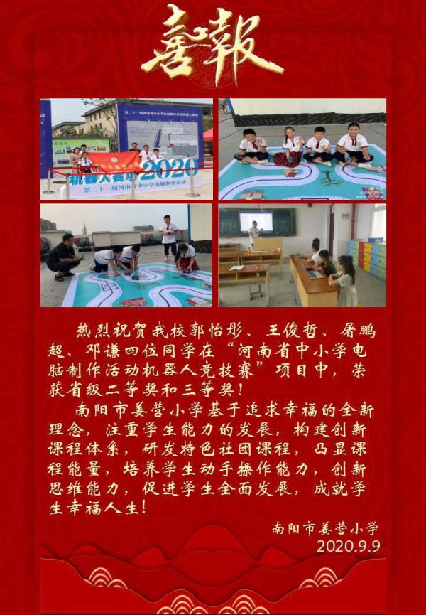 卓越姜小少年郎,拼搏进取绽光芒姜营小学 王丹 冯露 南阳市姜营小学以“幸福教育”为理念,在培养学生习惯的基础上,以培养学生全面发展为己任,全面提高学生的各项能力。为了丰富学生校园文化生活,满足学生的多元文化需求,充分挖掘学生的潜能,推动校园文化建设,姜营小学积极开展各类社团活动,学校为学生精心打造了国画、书法、科学实验等15个社团活动涉及科技、艺术、文学等多个领域,学生根据个人兴趣爱好自主选择。丰富多彩的社团活动不仅让学生把爱好逐步变成特长,更为浓厚的校园文化注入了新鲜活力。 2020年暑假期间,姜营小学的郭怡彤、王俊哲、屠鹏超、邓谦四位“智慧少年”扬帆启程,参加河南省第21届中小学生机器人大赛,在全省各地区中小学校及县区青少年活动中心的几百支参赛队伍中脱颖而出,取得优异的成绩,荣获省级二等奖和三等奖! 比赛既是竞争,也是交流,在本次比赛中姜营小学的参赛选手们不仅取得了优异的成绩,更收获了宝贵的实战经验,这些收获得益于平时孩子们在校社团课程的丰富积累,孩子们训练起来也得心应手。梦想没有止境,我校将以参加此类活动为契机,继续创新教育教学模式,开发社团优势。充分发挥在科技创新教育方面的优势,为对科技创新感兴趣的同学创造良好的发展平台,积极培养创新型人才。 百舸争流,奋楫者先;千帆竞发,勇进者胜。今天的成绩是对昨天付出的回报,今天的荣耀更是明天成功的阶梯。姜营小学必定以此次表彰会为契机,站在新起点,谋划新跨越,铸就明天的新辉煌!相信,在学校这个温暖的大家庭里,有了我们今天的付出,姜营小学的明天会更美好!祖国的明天将更加灿烂!! 编辑 :邢有军 |