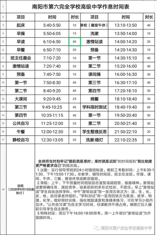 六全十二时辰在今天和明天之间,有一段很长的时间;趁你还有精神的时候,学习迅速办事。 ——歌德 本篇推文,为您讲述一个个平凡却又不平凡的教育点滴,以此见证第六完全学校高级中学(南阳外国语中学)师生为梦想淬火成钢的过程。 这是六全全体教学业务骨干精雕细琢,细细打磨出来的周密严谨的作息时间表,我们确保在校的每一分钟都是有效的,真正为学生三年负责,为学生一生负责! TIME 5:40-5:50 起床 早上5:40分,第一盏寝室灯光亮起,师生们开始陆续起床,成为这个城市最明亮的灯火。 起得早的同学们,等候开门与列队的间隙,趁最清醒的时刻,目光所及,皆是昨日重点且易忘的几个单词或半段古诗文。 TIME 5:50-6:10 早操 早操作为一日之序章,温暖又明亮。多年后,你们会回忆跟你们一起晨跑的老师们,陪伴不仅仅是接纳,更是共融。 在六全,我们呼吸共振,脉搏同拍! TIME 6:15-7:00 早读 早自习未开始,老师已到达教室,提前在黑板上写下晨读的任务,任务精确到每时段读什么。 暖心的班主任忙着往返净水机与教室之间,只为全班同学早晨喝杯温开水。 教室里,琅琅书声,一字一句,都如山间泉水,使人宁静清爽,催人奋发。 TIME 7:00-7:25 早餐 早餐前等候进入食堂的学子们。 早餐开启一日之均衡营养,更是为了让学生有一个强健的身体,增强学生的体质。 TIME 7:25-7:40 激情站读 读书的姿势有很多种,站读,更能集中注意力,也是青葱校园独有的记忆。 TIME 7:40-9:20 上午课程 一天的课程正式开始,在每一堂课上,都给人留下强烈的印象。 TIME 9:20-9:45 大课间 阳光的心智、健康的体魄,一个都不能少,同学们昂首挺胸,飒爽英姿,动作整齐划一,展现了六全学子“昂扬向上、坚忍不拔、直冲云霄、你追我赶”的奋斗精神。 TIME 9:45-11:15 上午课程 整个课堂同学们专注,又异常活跃,每一位同学都是课堂的主角,不像是在听课,像是在共同研讨,分析交流。压轴出场的是老师,老师进行总结、知识点的梳理、要点的强化讲解。 TIME 11:25-12:00 公共自习 学生们才是课堂的主角,老师只是“引路人”、“解惑者”和“朋友”。 TIME 12:00-12:30 午餐 午餐时间,触及我们的不是今日食谱,而是秩序! TIME 12:30-13:05 静校自习 对上午的课程进行梳理。 TIME 13:10-13:50 午休 合理的午休可以帮助学生恢复体力、精力,有助于下午的学习。 TIME 14:00-14:20 激情站读 午休后站读,是立即激活下午场战役的有效途径。 TIME 14:20-16:00 下午课程 有趣的地理课堂,全班被老师的形象讲解沸腾了,跟着比划了起来。 TIME 16:00-16:30 课间操 TIME 16:30-18:10 下午课程 课堂上,专注听讲是我,认真记录是我,热烈讨论是我。 TIME 18:10-18:40 晚餐 TIME 18:40-19:40 学科限时测试 日日清,让知识有反馈,这是六全人每天的目标。 TIME 19:50-21:40 晚自习 华灯初上,紧张的一个白天很快过去了,从19:50到21:40,是晚自习的时间。自习指定的科目,有老师前来辅导和监督,依然有精确到分钟的任务安排。 每一个完美的课堂,都有无数幕后的辛苦付出。我们的备课、磨课、听课和评课是每天的工作常态。 TIME 21:50-22:10 整理反思 学有所思、学有所获,是学子每天的目标。 TIME 22:10-22:30 熄灯 整理内务、探讨与分享,这是室友们最开心的时刻。放学途中的星辰,见证着我们的努力。 六全的办学理念有这么一句话:调动内因,激发潜能。 这几张动图,应该是对这一理念的很好诠释。 从熹微的晨光,到夜半的灯火,这是每个六全人普通平凡的一天。明天太阳初升时,又将开启美好又紧张的征程! 时间是一个伟大的作者,它会给每个人写出完美的结局。加油吧,六全学子! (邢有军 叶青) |