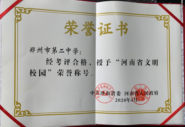 四、精神文明建设卓有成效,被授予“河南省文明校园”荣誉称号。 本年度,学校的精神文明建设取得突出成效,4月份被授予“河南省文明校园”荣誉称号。在迎接郑州市全国文明城市检验的过程中,作为迎检点位学校之一,被区、市、省文明办及中央文明委抽中,学校的精神文明建设受到了上级领导的高度认可。