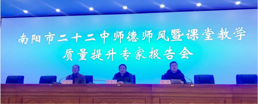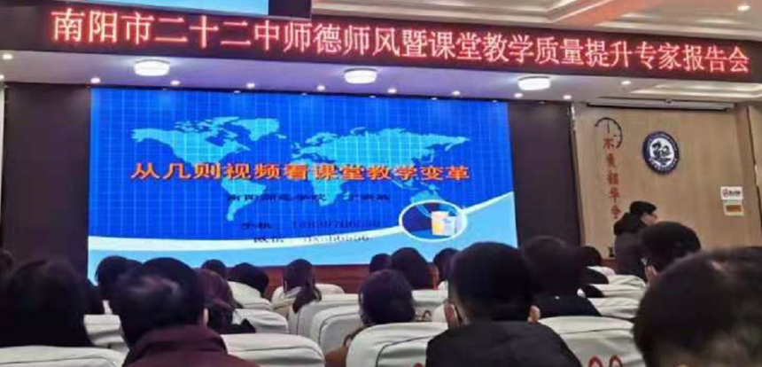 南阳市第二十二中学校举行师德师风暨课堂教学质量提升专家报告会中广视网:新的学期,南阳市二十二中将狠抓教育教学质量,大兴课改之风,确定2021年为“教育教学质量提升年”。为此,2月25日该校在学术报告厅隆重举行师德师风暨课堂教学质量提升专家报告会,邀请南阳师院丁新胜教授作报告,全校教师认真聆听了专家讲座。