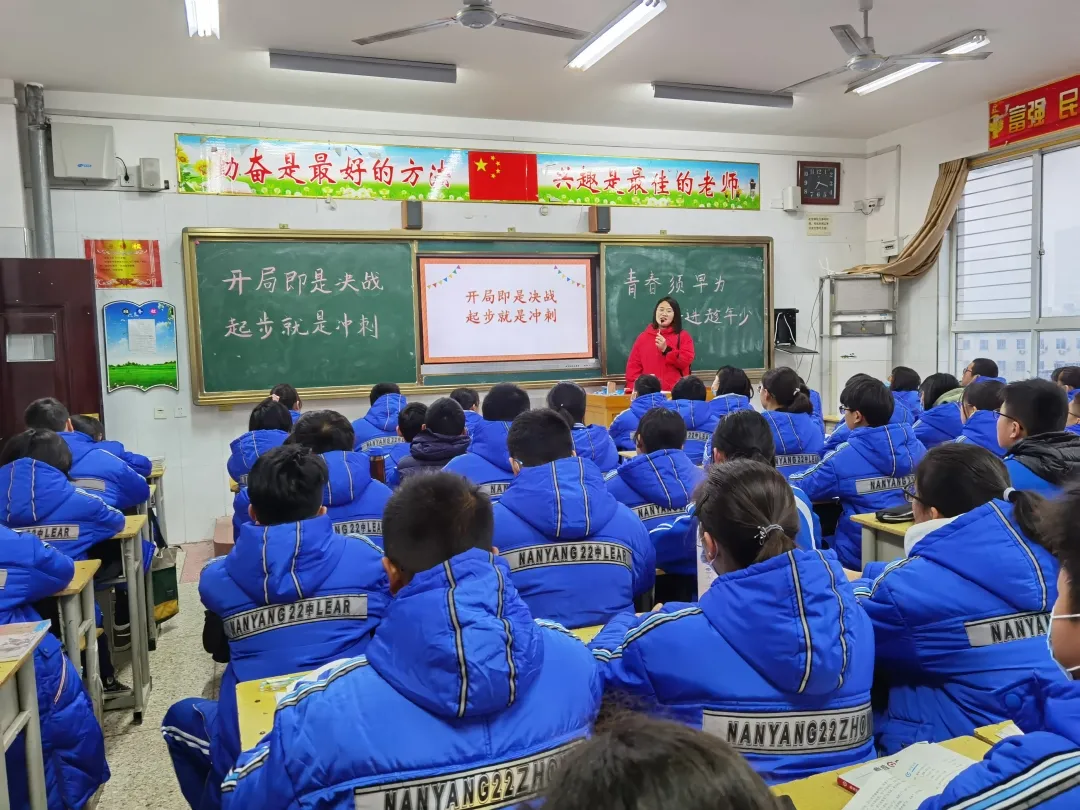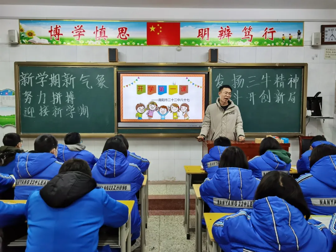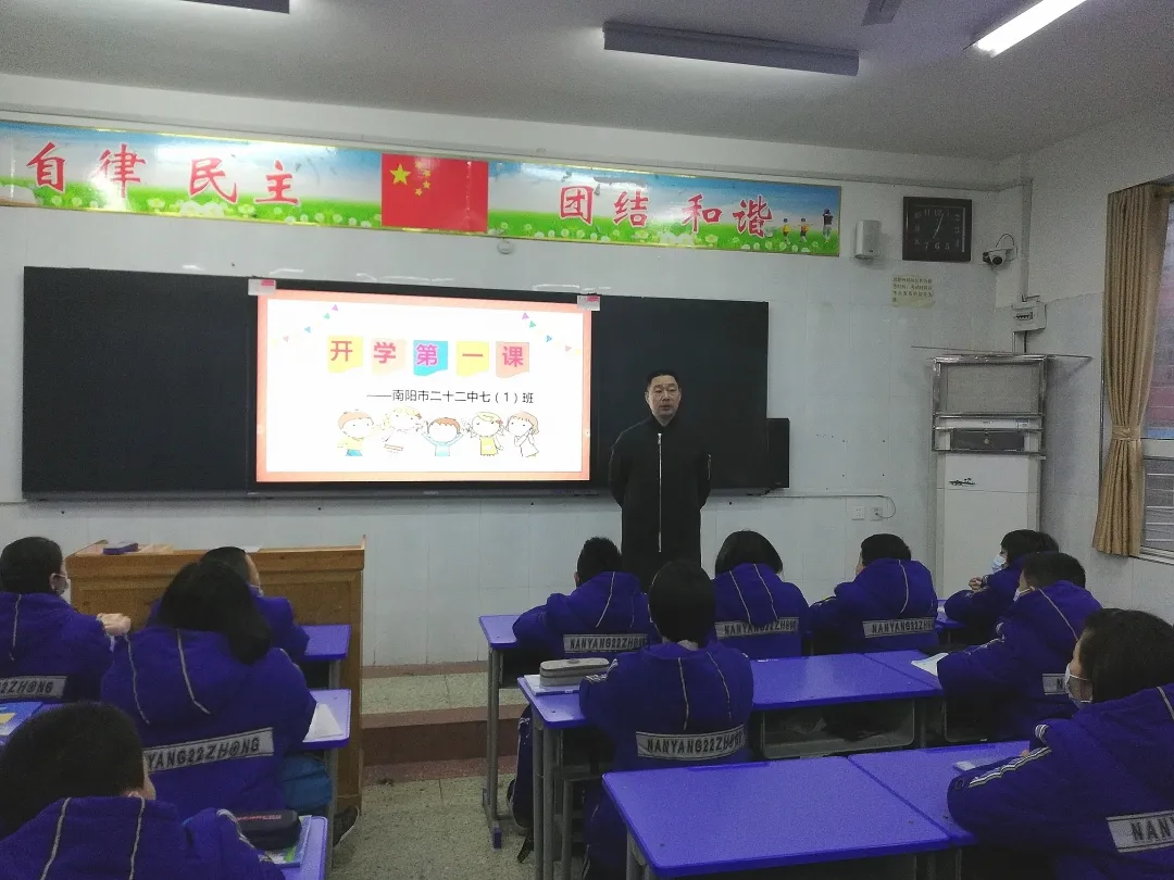 南阳市二十二中开展“开学第一课”主题班会活动中广视网:2021年3月1日,开学第一天,在晨风春雨中,南阳市二十二中的学子们如期返校。大门口,该校全体领导及德育处全体人员提前到岗,按照疫情防控要求,做好安全有序返校开学工作。 开学前,该校党总支书记、校长付金鹏亲自安排部署,多次召开校委会,要求制定详细的常态化疫情防控方案,采取科学有力措施,确保新学期安全有序开学。要求德育处提高政治站位,紧紧围绕立德树人,五育并举根本任务,认真组织开展好“开学第一课”主题班会教育活动,为学生们准备一份精神盛宴,为全市返校开学的平安、稳定、有序开展交上一份满意答卷! 3月1日早读时间,该校各班准时召开“开学第一课”主题班会活动。付校长首先发表了热情洋溢的新学期寄语广播讲话。