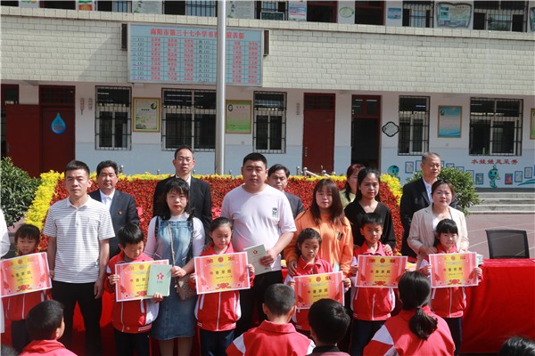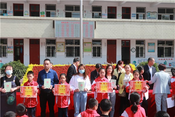 表彰先进 牢记使命 不断成长——示范区37小学期中表彰大会百舸争流千帆竞,乘风破浪正当时。为激励全体师生奋发向上,表扬先进,树立典型,5月8日上午,示范区37小学召开期中考试表彰大会。校长任成安、副校长胡怀普、杨长奇、张晨红,德育处主任杜剑、教导处王主任、李主任、工会主席李献道及全体师生参加了大会。本次大会由张晨红校长主持。 大会流程: 师生齐唱国歌后,由李献道主席宣布对优秀学生的表彰决定,由杨长奇校长宣布了对书香学生、书香家庭的表彰决定,由胡校长宣布了对优秀学生干部的表彰决定。 颁奖活动,依次颁发“学习标兵”奖、“书香学生、书香家庭”奖、“优秀学生干部”奖。 颁奖盛况: