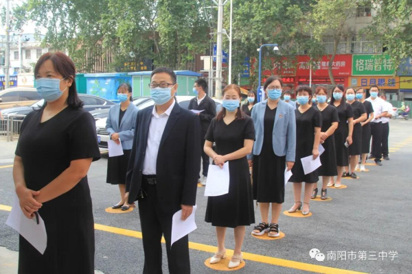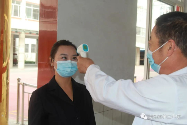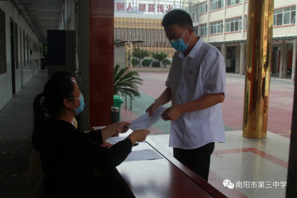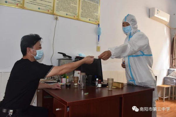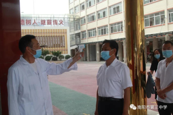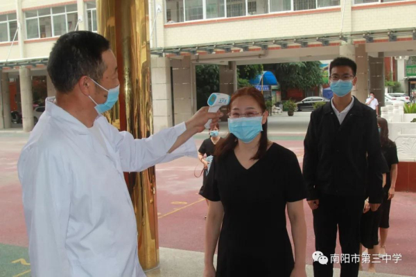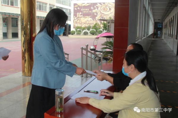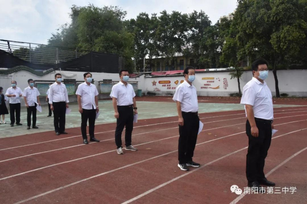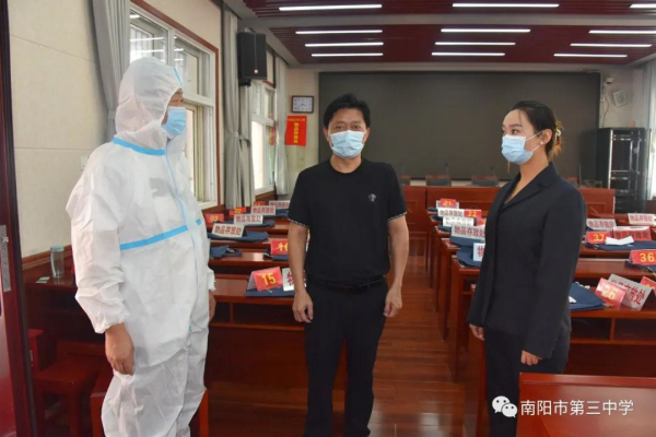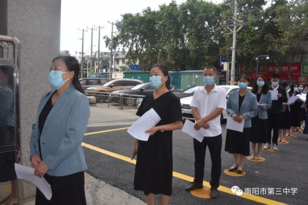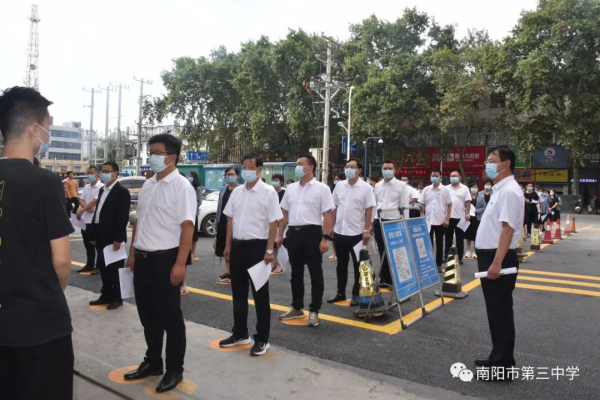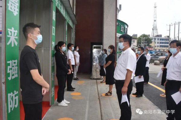 平安开学 开学平安——南阳市第三中学举行开学前疫情防控应急演练为进一步强化疫情防控工作,南阳市三中于9月5日下午开展“平安开学、开学平安”疫情防控应急演练。此次演练,对师生入校、晨检午检、疑似人员情况处理、课间活动及学生放学等各个重点时段的场景进行模拟演练,为保障开学的安全有序提供了样本参照。 科学部署,详细规划 严防死守阻病毒,齐心协力护校园。为确保演练贴近实战,校领导班子提前召开疫情防控演练专题会。会上赵庆峰校长明确指出,大疫之前要有大爱之心,更要注重细节,体现责任心和行动能力。要通过模拟演练进一步规范和检验各个方案的科学性和可操作性,提高学校全员防控能力。在安全防疫方面要做到零出错,务必把控好学生入学后的每一个疫情防控细节,让学生能够安心学习,让家长放心把孩子交给学校。