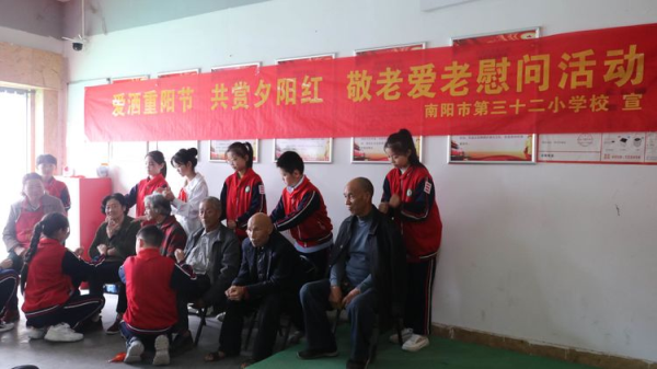 爱洒重阳节 共赏夕阳红——南阳市第三十二小学校开展到敬老院慰问演出活动 10月14日下午,在学校党支部的大力支持下,在副校长李文奇和校少工委的组织下,南阳市第三十二小学校联合枣林街道办事处党工委带领数名小志愿者来到李营村幸福大院,开展重阳节慰问演出活动,为老人们送去节日的祝福。
