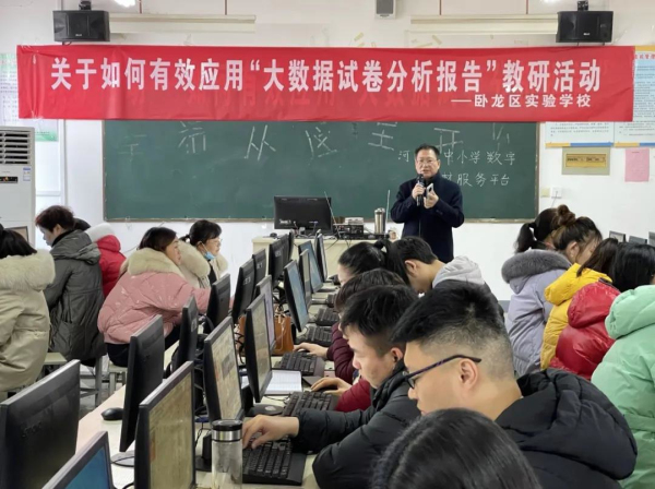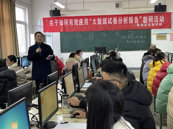 卧龙区实验学校 “如何有效应用大数据试卷分析”教研活动2021年12月15日上午,南阳卧龙区实验学校组织我校三至六年级语数外教师,在计算机教室进行了河南省数字教材应用云大数据测评系列教研活动。本次教研活动围绕“如何有效应用大数据试卷分析”这一主题进行。通过大数据教学平台提供的成绩分析报告,更加科学、精准地进行学科分析。