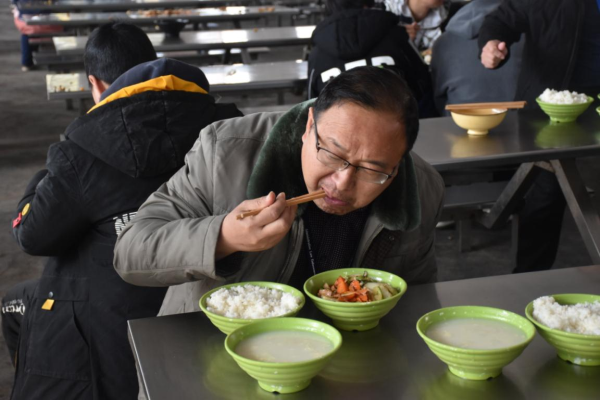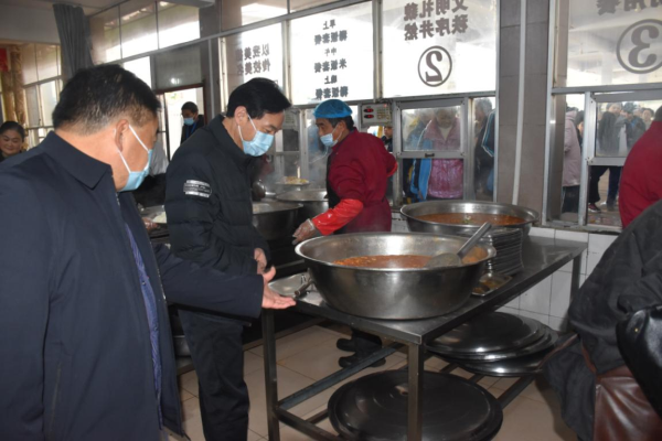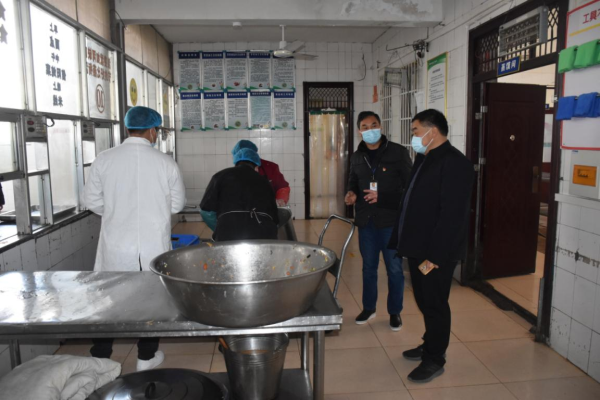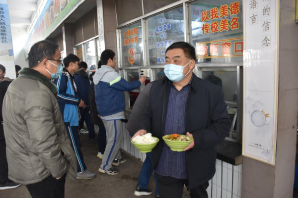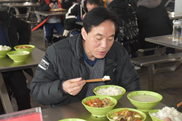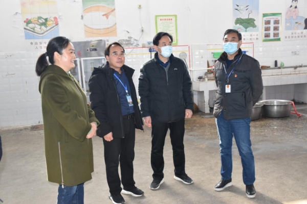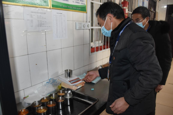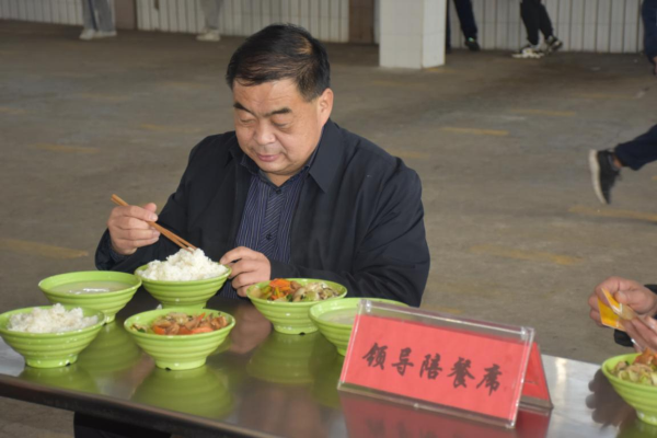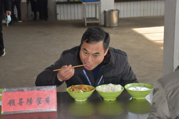 各位领导对学生食堂开展现场检查。从学校食堂从业人员健康证明,到土豆、豆芽等食材进货查验;从冷藏冷冻设施维护,到仓库食品贮存使用;从食品加工制作,到成品备餐分餐;从餐具清洗消毒,到食品成品留样;从餐厅“三防”设施布局,到制止餐饮浪费宣传等,进行了认真细致地检查指导。李局长对汉冢中学学生食堂管理工作和食品安全工作给予充分肯定。杜群策校长、李秋菊管理员对领导的询问一一做了准确地回答。 民以食为天,食以安为先。学生饭菜的数量、质量,是领导们最关心的的事。李局长一行四位领导陪餐品尝学生饭菜,为汉冢中学留下了最难忘的时刻。