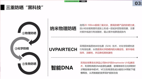 目前市面上的防晒霜产品可分为物理防晒和化学防晒,传统物理防晒:是像镜子一样反射紫外线,使它无法穿透皮肤,从而达到防晒效果。物理防晒的优点是对皮肤刺激小,适合对化学成分过敏的敏感肌和孕妈,以及婴儿。缺点是质地厚重、油腻、肤感较差,容易泛白。目前常规防晒品牌难以做到屏障修护,传统医学护肤品牌做不到全面抵御光损伤,好肌茵革命性的将二者有效结合,首次独创性提出基因防晒科技,将物理+化学+生物防晒技术进行结合,做到了高倍防晒的同时,还能做到对过去已经造成的光损伤进行修复,即使敏感肌也能放心使用。