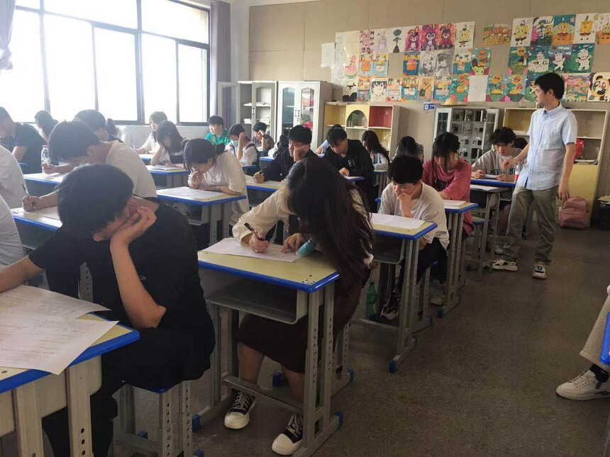 全体监考人员坚守岗位,认真履行监考职责;考生遵守考场纪律,仔细审题,认真书写,考场秩序井然。