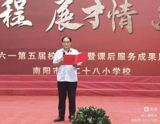 8:20分,以“悦课程,展才情,乐成长”为主题的“六一”汇演正式开始。首先校长勇梅致祝贺词,她真诚地希望同学们能在活动中激情昂扬,充分展示自己的才华,不断跃上新的台阶。接着宛城区教体局教学研究室主任段天才代表到场的所有领导,祝同学们节日快乐,祝本次六一汇演圆满成功。