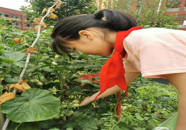你看,花生种子已经吐出浅绿色的嫩芽,在微风细雨中努力生长;黄瓜已经破土而出,你追我赶连成片的生长;那一株株玉米苗正朝着太阳的方向,焕发着勃勃生机。菜园总是从沉默的种子开始,到一片片肥大的叶片,到一个个让你垂涎的果实,瞧那嫩绿的黄瓜和带着蔬果芳香的西红柿,不就是最好的证明吗?孩子们看到这茁壮生长的瓜果蔬菜,感受劳动带来的幸福与甜蜜。孩子们不怕脏不怕累,在不断的实践中逐渐掌握了劳动技能。