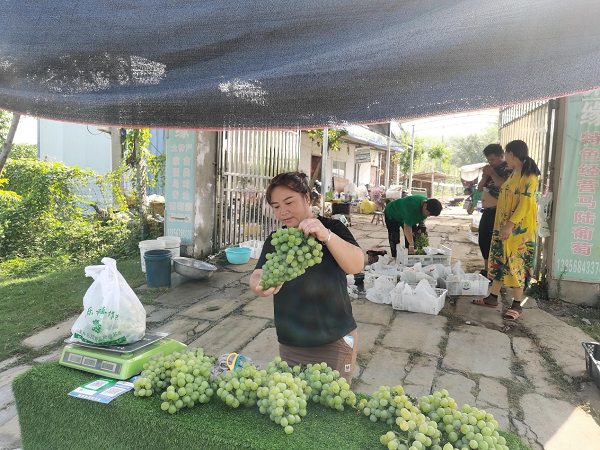 2018年5月,付屏积极响应上级号召,返乡创业助力脱贫攻坚,她在镇村的帮助下,以800元/亩,流转了10亩土地,创办了蒙城县于佳乐种植专业合作社,建成了高标准葡萄种植大棚。种葡萄是技术活,管理很重要。从开花到结果,保花保果最为关键。“付屏一边采摘着葡萄,一边介绍说,她种植葡萄已有4年时间了,重点培育了醉金香、玫瑰香、巨丰等新型葡萄品种,通过不断地学习和摸索,逐渐掌握了关键技术要领,葡萄园效益也越来越好。从发芽修剪到修穗疏果,都需要大量的人工。每到忙碌的时候,她就会找来本村的留守妇女、脱贫户让他们帮忙管理,脱贫户王侠就是其中之一,长期在葡萄种植园务工,每天50元。