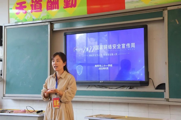 网络安全进校园 筑牢青春防火墙为深入开展网络安全宣传教育、提升广大师生的网络安全意识和防护技能,9月5日上午,南阳市二十一学校举行2022年国家网络安全宣传周活动启动仪式,张瑛校长出席启动仪式并讲话。张瑛校长在讲话中指出,要筑起防火墙,撑起守护伞。要坚持不懈抓好师生网络安全意识教育,组织好网络安全宣传周校园日活动,利用校园电视台、校园广播站、主题班会、信息技术课等广泛宣传普及网络安全法律法规和知识技能,推动全校形成学习网络安全的浓厚氛围,不断提升师生的网络安全意识和防护能力。
