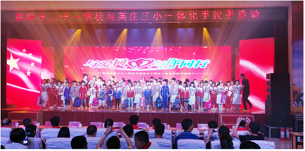 开展手拉手结对子活动,进行一对一帮带。一是学生及家长层面的手拉手活动。英庄三小的100位品学兼优、家庭相对贫困的留守儿童,与二十一学校富有爱心、家境优裕的100位学子结成手拉手对子,推出了二十一学生家长认领英庄三小贫困留守儿童的举措,在举行了隆重的“与爱同心,与你同行”手拉手活动仪式和文艺表演后,二十一小学生家长带着认领的孩子回家认亲,赠送衣服和学习用品,还带着孩子城区游玩,带孩子到饭店吃饭。下午两个小伙伴一起到卧龙岗研学旅行,城乡孩子相互学习,相互促进。