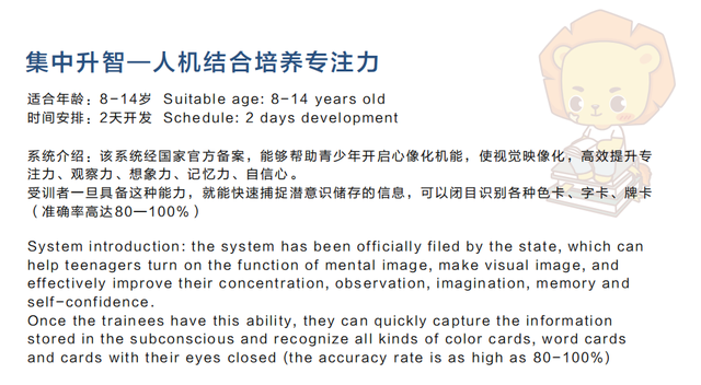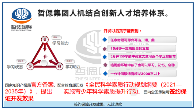 孩子开发后能做到: 任意命题可即兴写诗、词、曲 15分钟一篇高质量的文章 5分钟150字的中英文文章可逐个字正背倒背 喧闹的环境中孩子也可以学习、记忆、创作 一分钟阅读速度超过2000字以上 哲偲国际心灵成长系统: