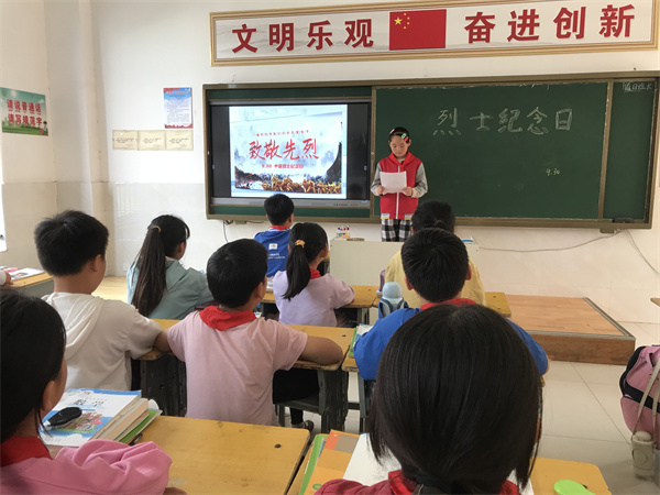 2022年9月30日当天上午十点,全校师生在班级利用班班通一起观看习近平主席等党和国家领导人将同各界代表一起,在天安门广场向人民英雄敬献花篮,孩子们跟着同唱《中华人民共和国国歌》。 让孩子们懂得“历史是最好的教科书,也是最好的清醒剂”。学生通过老师讲解革命烈士事迹、观看爱国主义影片,深切感受到现在和谐、幸福生活的来之不易,增强了孩子们学好知识本领、为报效祖国做出自己的努力,学生在老师和同学的诗歌中感受到了烈士精神,牢牢铭记历史。