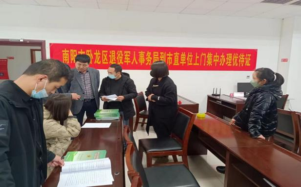 南阳市卧龙区退役军人事务局主动登门为辖区机关(企)事业单位集中办理优待证为进一步推动优待证申领制发工作,南阳市卧龙区退役军人事务局联合市退役军人事务局及合作银行,引导辖区退役军人服务站登门服务,先后为市直单位、辖区企业等相关部门的退役军人、优抚对象提供精准、优质、高效的办证服务,让优待证办理更用心、更真心、更暖心。