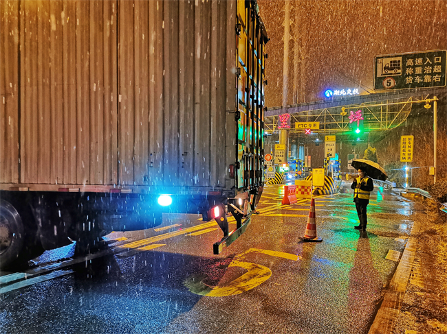 “师傅,别着急!高速上正在撒盐除雪,可以先在外广场休息”。1月15日凌晨3时许,在六里坪收费站口,收费员邓远鑫一手打伞,一手拿着扩音喇叭,引导车辆掉头。因为天黑夜寒,收费站外广场有部分滞留司机在焦灼等待,志愿者迅速出动疏导指挥,为过往司乘送热水,提供路况信息。寒冷冬夜,25岁的邓远鑫在道口前一站就是8个小时。下班的时候,还不忘嘱咐接班收费员,做好交接工作。(文图/贺永) |