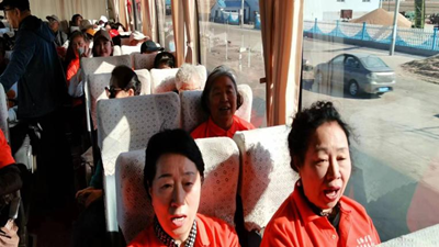 下午3点,结束旅行,回来的路上大家意犹未尽,李伟老师带领大家唱起了革命歌曲。让我们最欣慰的是,洮北区民政局姜阳局长,明仁街道刘佰东书记电话跟踪,嘱咐我们一定照顾好每位老人,安全第一,在一整天的活动中,54人无一人受伤,晚上6.30分到家,两位领导才放下了心。