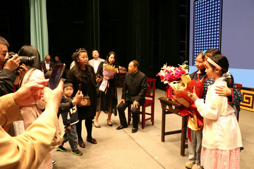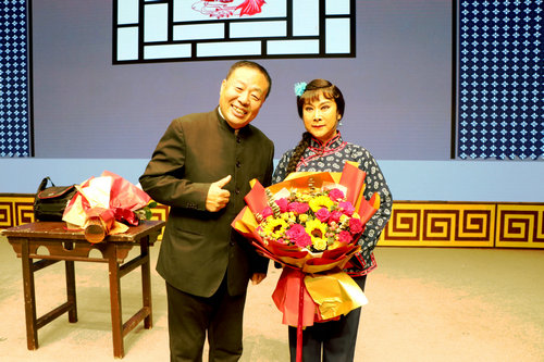 评剧老戏迷孙佑刚向张秀云赠送鲜花 《杨三姐告状》是评剧舞台上久演不衰的优秀剧目,本次以剧情紧凑,表演细腻,唱腔动听,尤其是“悲剧喜演”的整体艺术风格,为广大观众所推崇,这也是大半个世纪,以谷文月、赵丽蓉、张秀云等诸多评剧表演艺术家演出版本最受欢迎的剧目。