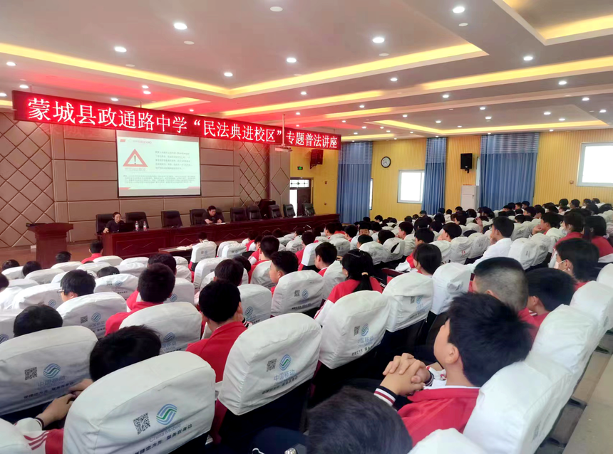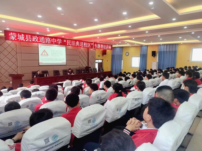 在普法宣讲会上,蒙城县人民法院庞然法官作了题为《民法伴成长》专题报告。他从介绍我国民法典、学习《民法典》总则、《民法典》如何保护我们的权益、同学们如何学会自我保护四个方面进行授课。他还用发生在身边的真实案例向参加本次活动的师生们生动地讲述了《民法典》;在讲述“民事权利能力和民事行为能力”时,还对未成年人犯罪行为进行了阐述;精彩的报告赢得现场师生的阵阵掌声。