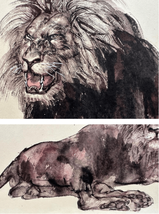 王阔海作品《雄风图》局部(上、下) 比如王阔海先生的《雄风图》图,画三头狮子,中间一头侧卧正视,目光坚凝,其狮子面部刻画更注重大型体与小形体的塑造,给人一种可触可摸,形象极其逼真,较之前人更为贴近对象!且笔墨轻松自若绝无死抠之嫌,可谓轻松而紧密,疏朗而厚重,可谓形神皆备,不怒而威,亦暗示睡醒后的中华民族这头雄狮力量的自信与坚毅。再看狮子的臀部与两后腿之间的结构刻画的让人称道,后蹄子是底部外翻其体积感与透视都是极难表现的难点,这却让王阔海先生画的自在轻松,微妙微俏,令人拍案叫绝!而狮子右边一头狮子鬃毛立起,“怒发冲冠”,目视左侧,四腿坚实,沉稳伫立,其线与面的神出鬼没,笔与墨的纵横交错,一派浑然天成。其狮子头微抬、嘴开张,作怒吼状可感“声威震天”的主题。左边一头侧身瞠目向右直瞪,与右边两头狮子成互应之势,蓄势待发,迥然有神,鬃毛随风飞扬,呈现出威风凛凛的气势。以赭石淡墨设色,用笔爽气明快,结构简洁精准,表达出一种果敢坚定的力量和昂扬向上的精神。 再一幅《王者之气》,狮子虽身卧而雄姿挺拔,筋骨强健,看上去气定神闲,画出了狮子不怒而威的王者风范。随着画面走势作草书题跋,或长或短,或大或小,错落有致,与狮子的姿势相得益彰,反映出王阔海先生随心所欲的画面把控能力,诗书画印浑然一体的文人画特质与韵致。同时也透露出,王阔海先生作为一位画家其坚定自信的“王者风范”,蕴含着作为一位艺术家对中华民族必然复兴的文化自信。而这种风范,是徐悲鸿一代大师在那种国破家亡的特殊年代所不具备的。