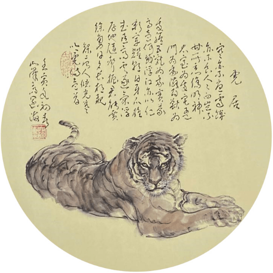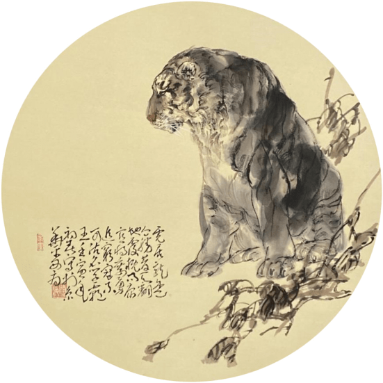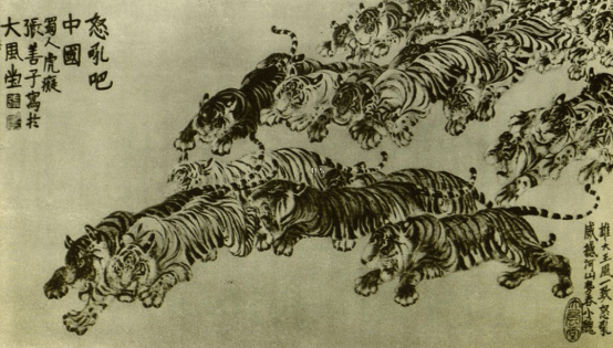 王阔海作品《王者之气》 在中国古代,由于狮子是外来物种,画狮子是由画师或工匠以画谱口诀来完成的,在民间传说当中更多将狮子塑造为正义、吉祥、庇佑人间的灵兽,通过画谱为蓝本描绘出的狮子形象,只带有吉祥寓意的模糊形象。进入新时期,狮子被赋予新的象征符号,如果说在徐悲鸿等上一代画家笔下是带有悲壮色彩的写实形象,那么到了王阔先生这一代画家笔下则赋予和塑造为新时代中国崛起的真实写照,作为两代绘画大家,将动物走兽大写意都画成了一个时代的中国画典范。在新时期王阔海先生以新的画法,把徐悲鸿大师开辟的中西合璧之路向前推进到一个新的高度。 狮子之后,我们再看画虎。 在现代画虎的名家中,张善孖,高剑父高奇峰兄弟,胡爽庵,刘奎龄、刘继卣父子,冯大中等画家是其中的佼佼者。 张善孖(1882年—1940年)是张大千的二哥,画虎成癖,以画虎名噪一时是近代中国画虎第一人,人称“画虎宗师”。张大千也因为尊敬他而立誓不再画虎。张善孖笔下猛虎,既不失虎的威猛,又富有人性,含有一种温情。林语堂曾称赞道:“他画的老虎,凡一肌、一脊、一肩、一爪,无不精力磅礴,精纯逼真。”因为画得逼真,其笔墨写意性会有所降低。为了画虎,张善孖在家中养了一只老虎,每日观其神态,所以张善孖画的虎比较写实。再有张善孖张大千的弟子慕凌飞,入师大风堂,为实现张善孖的心愿,不负大千的嘱托,历时三十余年完成了中国画坛第一幅《百虎图》长卷,被誉为中国画艺苑中的一枝奇葩,但其画法未出师父左右,仍以逼肖为能事。