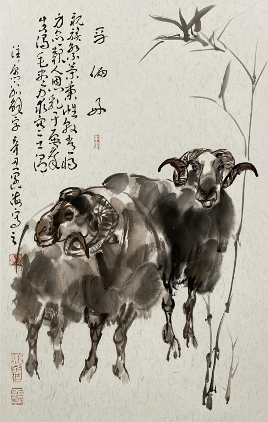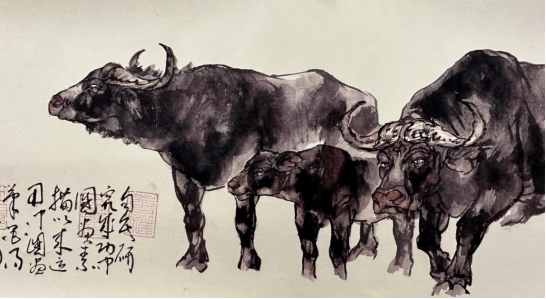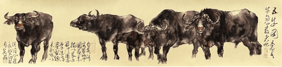 王阔海作品《五牛图》 王阔海先生画牛,可以说是千姿百态,帧帧不失大写意之魂。或卧牛、行牛、耕牛、牧牛, 或单牛、双牛、群牛,或老牛、小牛、母子牛,或食草牛、小憩牛、孺子牛,或凝目、回眸、俯首、哞鸣,或牛气冲天,或天牛卧看(题跋杜牧《秋夕》:“银烛秋光冷画屏,轻罗小扇扑流萤。天阶夜色凉如水,卧看牵牛织女星。”),皆刻画惟妙惟肖,多一笔嫌碎,少一笔不够,深得大写意精髓。既写实又写意,是王阔海先生既不与前人同,也不与现代李可染相同的自家画法,由此把中国画大写意画牛,推向一个更高的高度。 王阔海先生画过两幅《五牛图》,其中一幅画四头牛和一只小牛,一头俯首,一头昂首,两头目视前方,小牛依偎在母亲身边,形神兼备,意趣盎然。长题跋于左下方,参差错落,延伸至左边牛四蹄下,如一片草坪。其题跋曰: