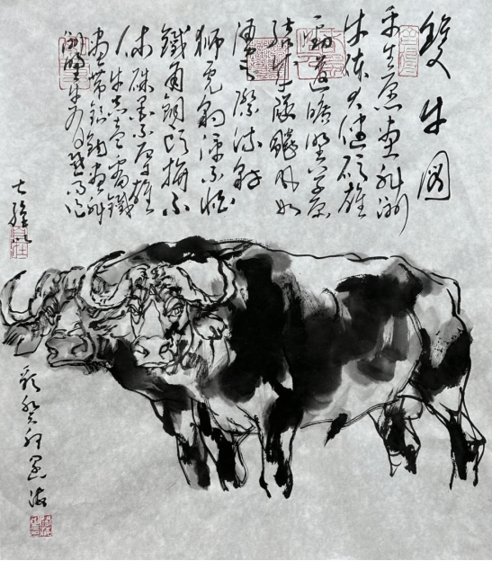 王阔海作品《双牛图》 “冰冻雪寒牛背暧,夜沉风吼不思归。忽听娘亲声声唤,泪眼婆娑只有回。柳绿草青花正艳,哞哞奋起踏春来。郎骑牛背书声亮,遍地芳菲尽落台。步履蹒跚低俯首,犁痕作浪汗成畴。只为仓廪粮常有,戴月披星尽瘁酬。” 观之读之,另人感慨万千!右边一则题跋,与之遥相呼应,几方印章盖得特别讲究,富有趣味,增加了画面的丰富性与动感,境界美妙,充满诗情画意。这是一幅难得的诗书画印完美结合的精品力作手卷。 李可染先生曾在画作《五牛图》上题字曰:“牛也,力大无穷,俯首孺子而不逞强。终生劳瘁,事人而安不居功。纯良温驯,时亦强犟,稳步向前,足不踏空,形容无华,气宇轩昂,吾崇其性,爱其形,故屡屡不厌写之。”可染先生的肺腑之言,谁又能不说这也是王阔海先生追求艺术之路上的写照呢?