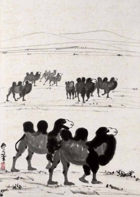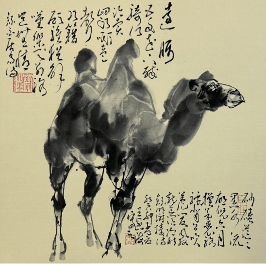 王阔海新汉画作品《昭君出寨》 最后,我们看王阔海先生画骆驼。现当代有吴作人以画骆驼闻名,但他用的是西画的画法,以块面造型见长,虽用水墨但并非中国画的笔墨。其骆驼头部也太为概括,不免失于空洞。与吴作人先生相比,王阔海先生画骆驼,用“中国画素描”与以线造型融合的“王阔海六法论”,画出的是既写实又写意的大写意骆驼。特别是那两幅《任重道远》和《小憩》图,气势宏大,其造型极为结实而深入刻画,笔墨姿肆汪洋,水韵墨痕顺机生发,笔情墨趣自然滥觞,足以看出明清徐渭、八大之笔墨遗韵。无怪乎中国美术史论家刘曦林先生对王阔海先生赞曰、“承接了八大徐渭续接至今的文脉精神,成为极少数承薪接火之人。”再从王阔海自题的一首七绝的后两句诗“今时亦失文长墨,斯图似出雪个庐。”足可看出王阔海先生的文化与艺术的自信。