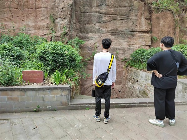 图为青“码”逐梦实践团成员在观察防空洞 接着向着山上走,不过数十级台阶,就来到了位于山顶的诗圣广场。诗圣广场坐落于峰顶地形平整之地,与杜甫草堂、聚贤楼、梓州阁密不可分相接。杜甫塑像处于广场与草堂大门口的中心线交界处,其忧国忧民之风韵有诗圣那时候怜悯众生的真情流露之感。
